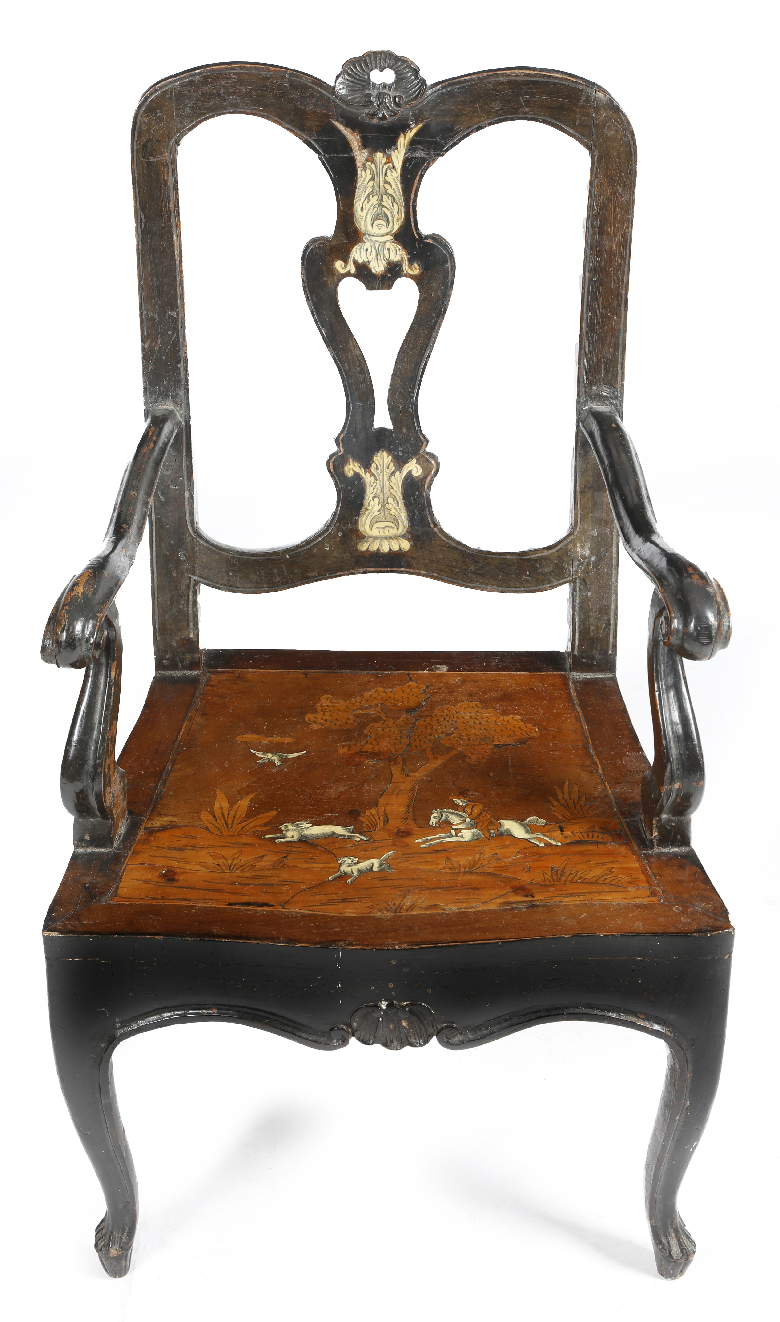 λ An 18th century Italian ebonised and walnut marquetry open armchair, the pierced splat back inlaid with ivory and penwork decorated leaves, the seat with fruitwood and ivory marquetry depicting a hunting scene, on cabriole legs, Lombardy.