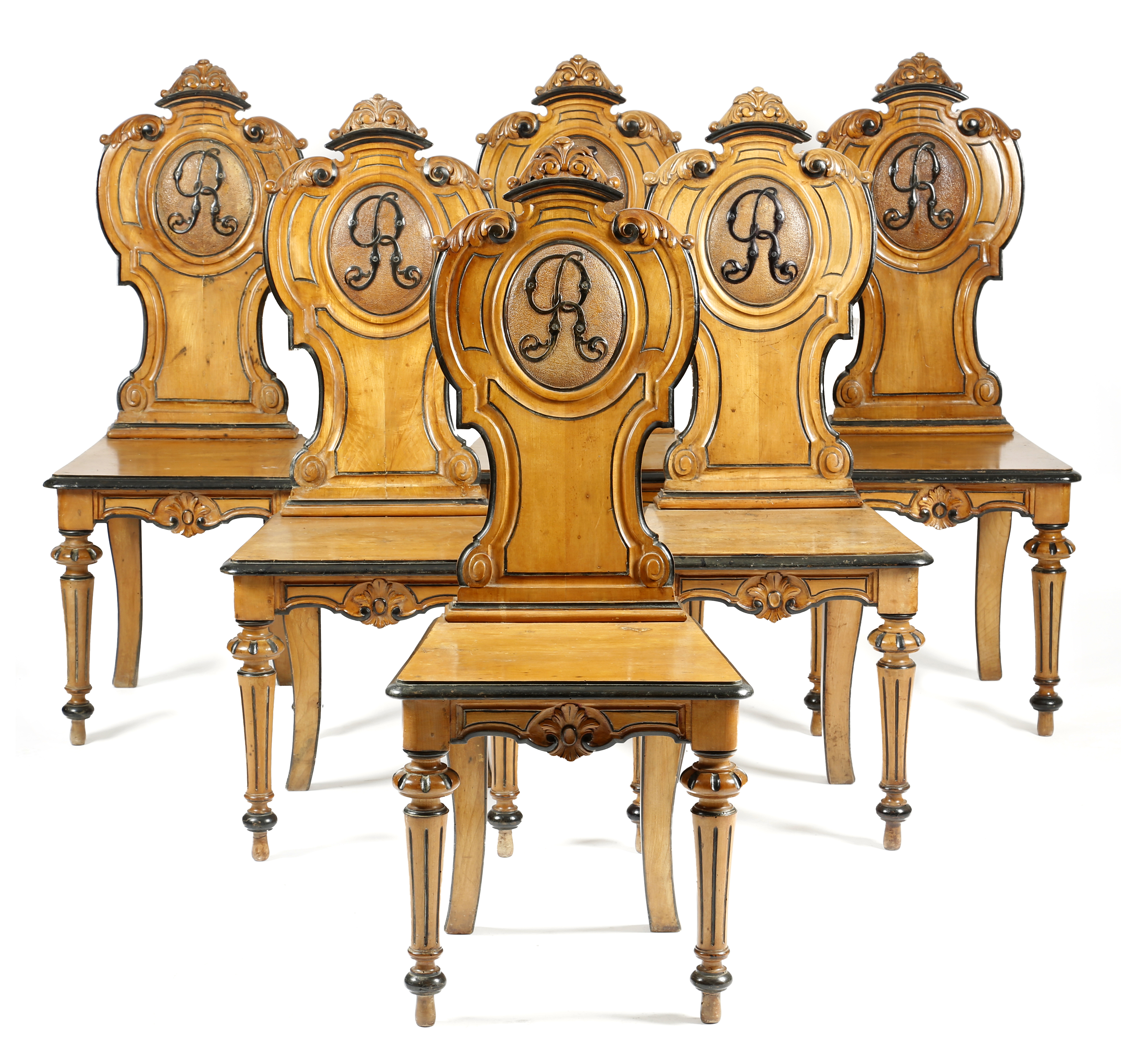 A set of six 19th century fruitwood hall chairs, with ebonised decoration, the leaf and scroll carved cartouche shaped backs centred with the initial 'R', by repute, for the Rockefeller family, on fluted front legs. (6)