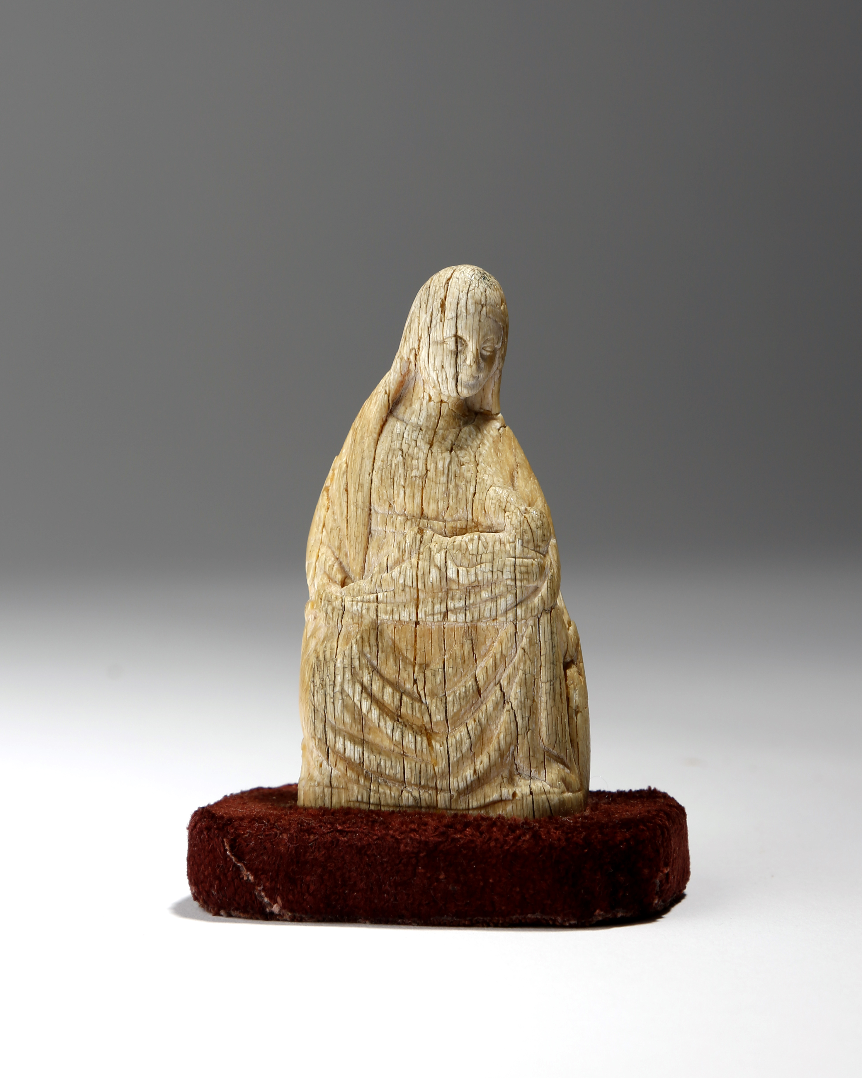This small but powerful statuette is related to a group of mysterious carvings which are little understood. There is a similar example in the V&A Museum collection and is illustrated in 'Medieval Ivory Carvings 1200-1550', by P. Williamson and G. Davies, cat. no. 182. The purpose of these carvings is unclear but one suggestion is that with similar ivories they would have formed a devotional panel / group.