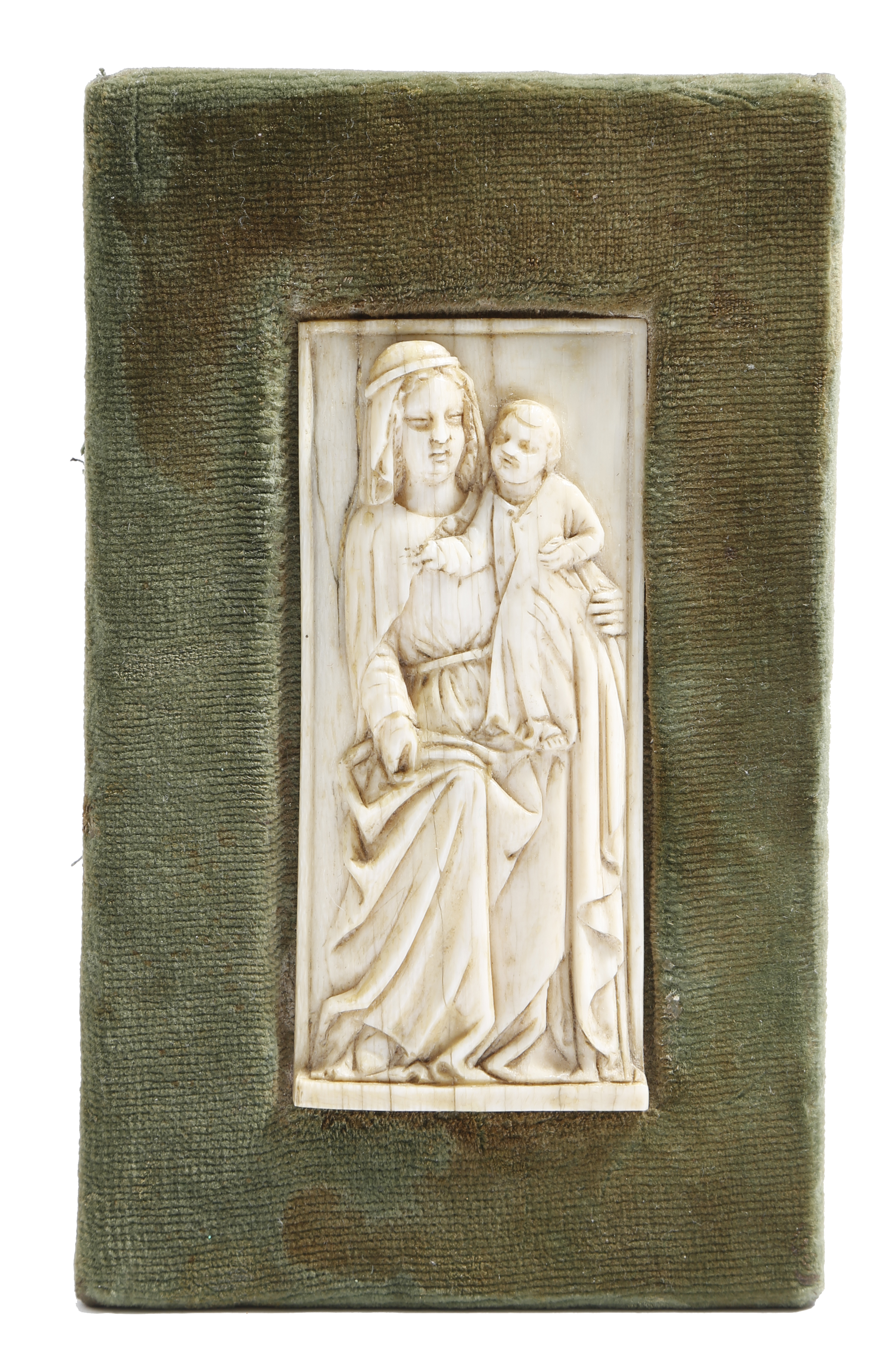 λ A late Medieval ivory relief carved plaque of the Virgin and child, possibly originally a book cover mount, probably Flemish, 14th / 15th century, 10.3 x 4.6cm, later mounted in a velvet covered oak frame with an easel back.