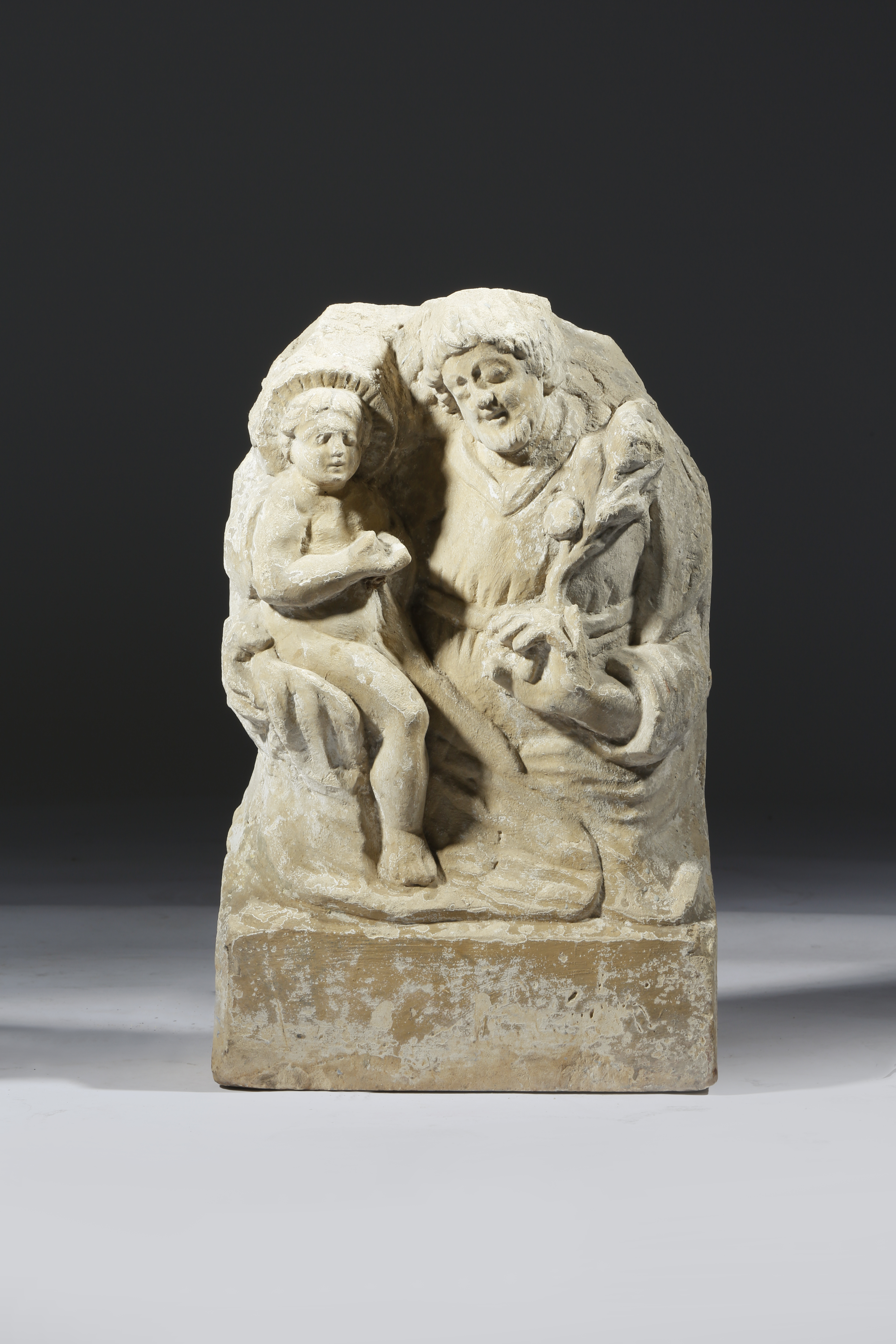 A 15th century French Caen stone relief, depicting St. Christopher holding a branch, carrying the infant Christ, with traces of polychrome painted decoration, 44cm high, 28cm wide.