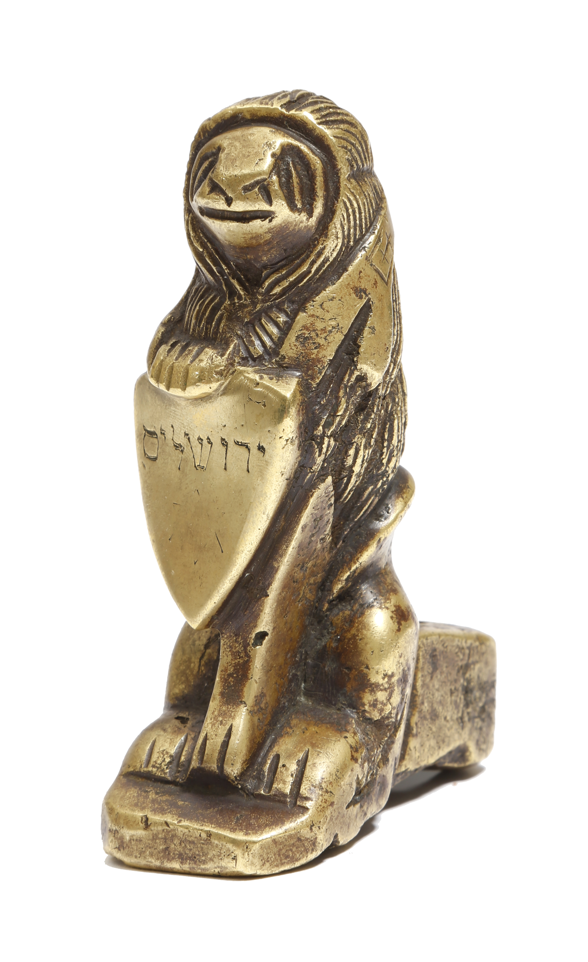 A bronze model of a heraldic seated lion, holding a shield, probably originally a chandelier / candelabra arm support finial, possibly South Netherlandish, Dinant, 14th / 15th century, 9.4cm high.