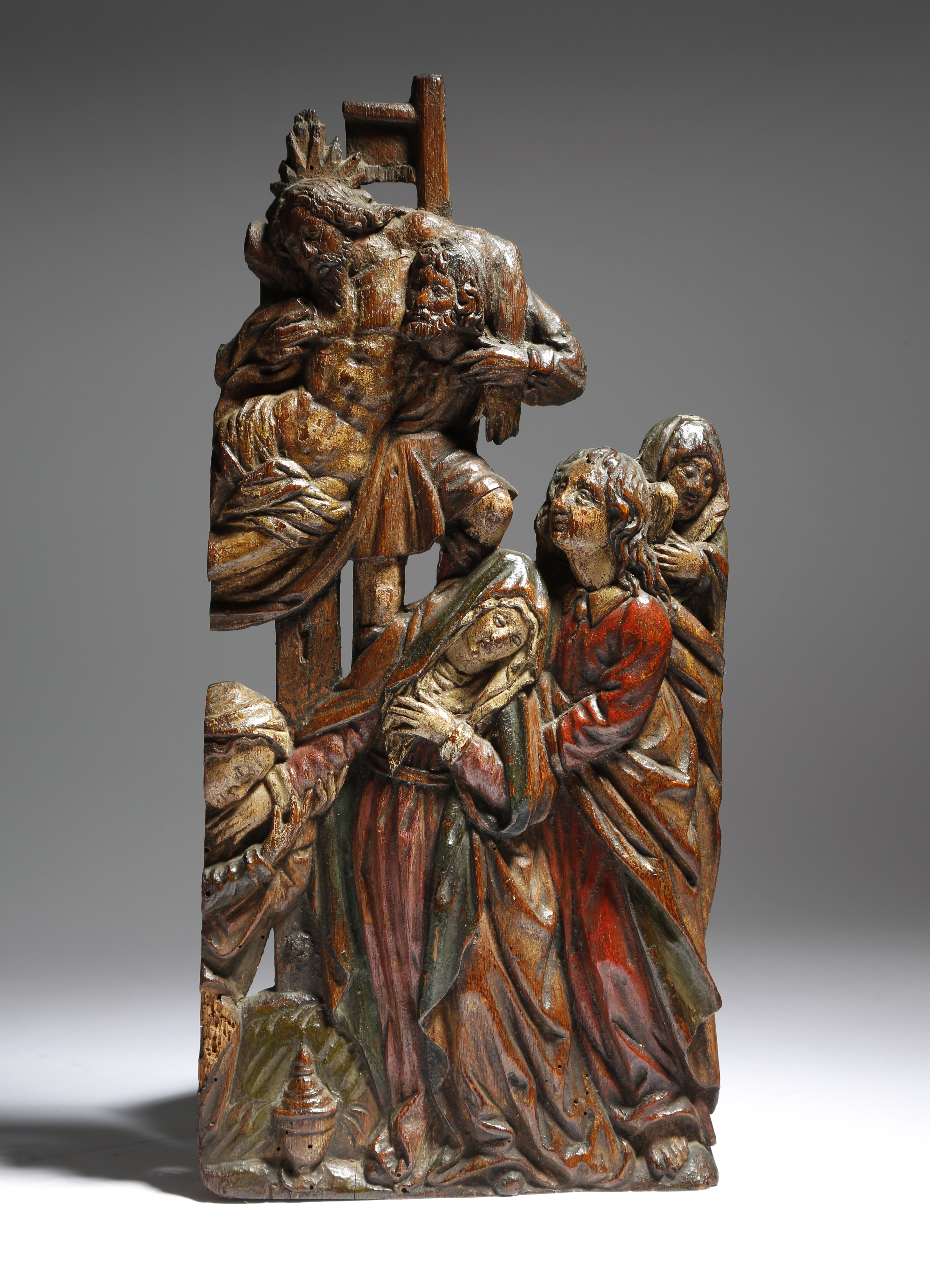 A Netherlandish carved oak and polychrome decorated relief fragment, depicting the Deposition of Christ, early 16th century, possibly Flemish, 39 x 18.3cm.