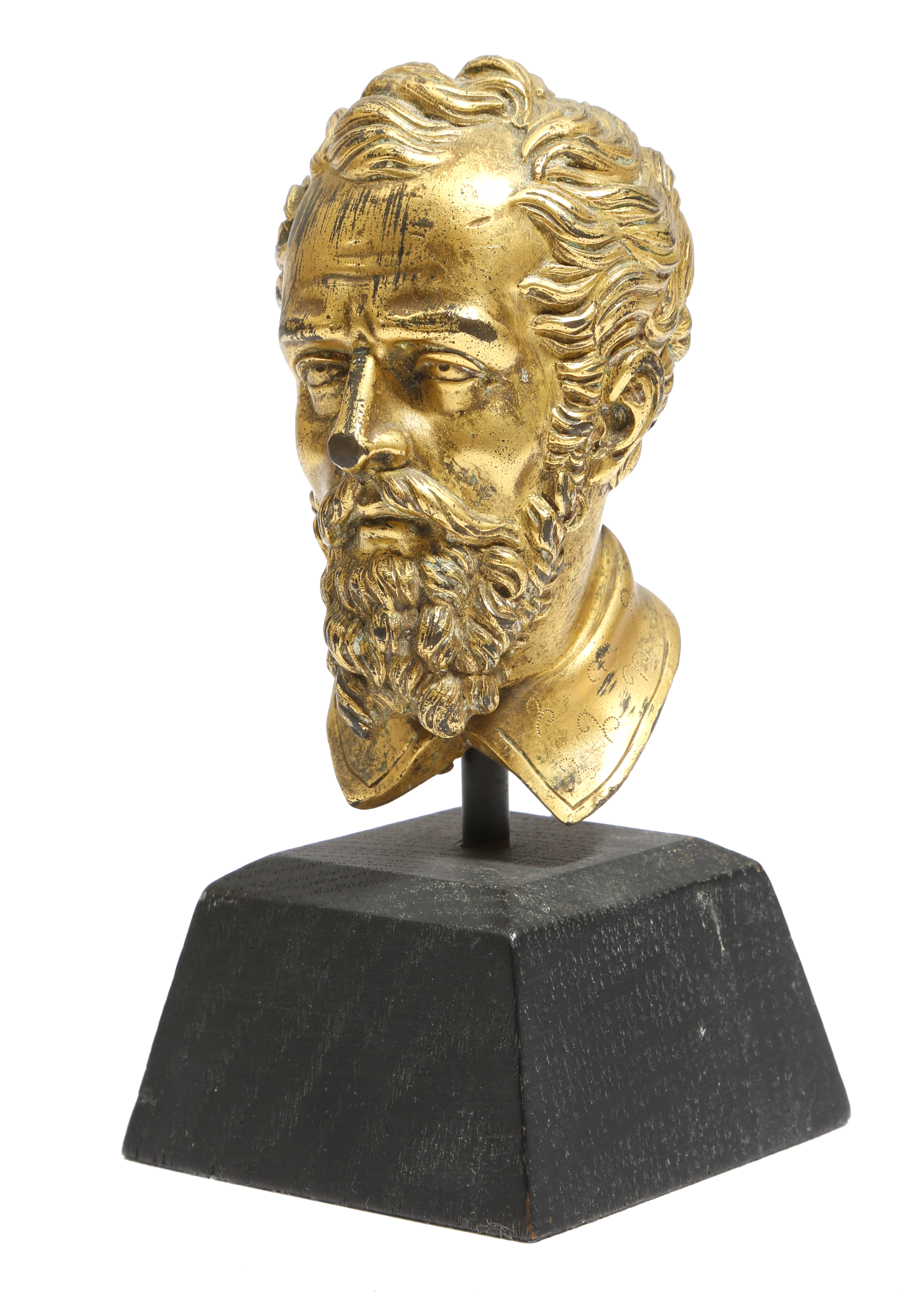 A gilt bronze bust of a bearded gentleman, possibly English, 18th century, 10.8cm high, mounted on a later ebonised plinth.