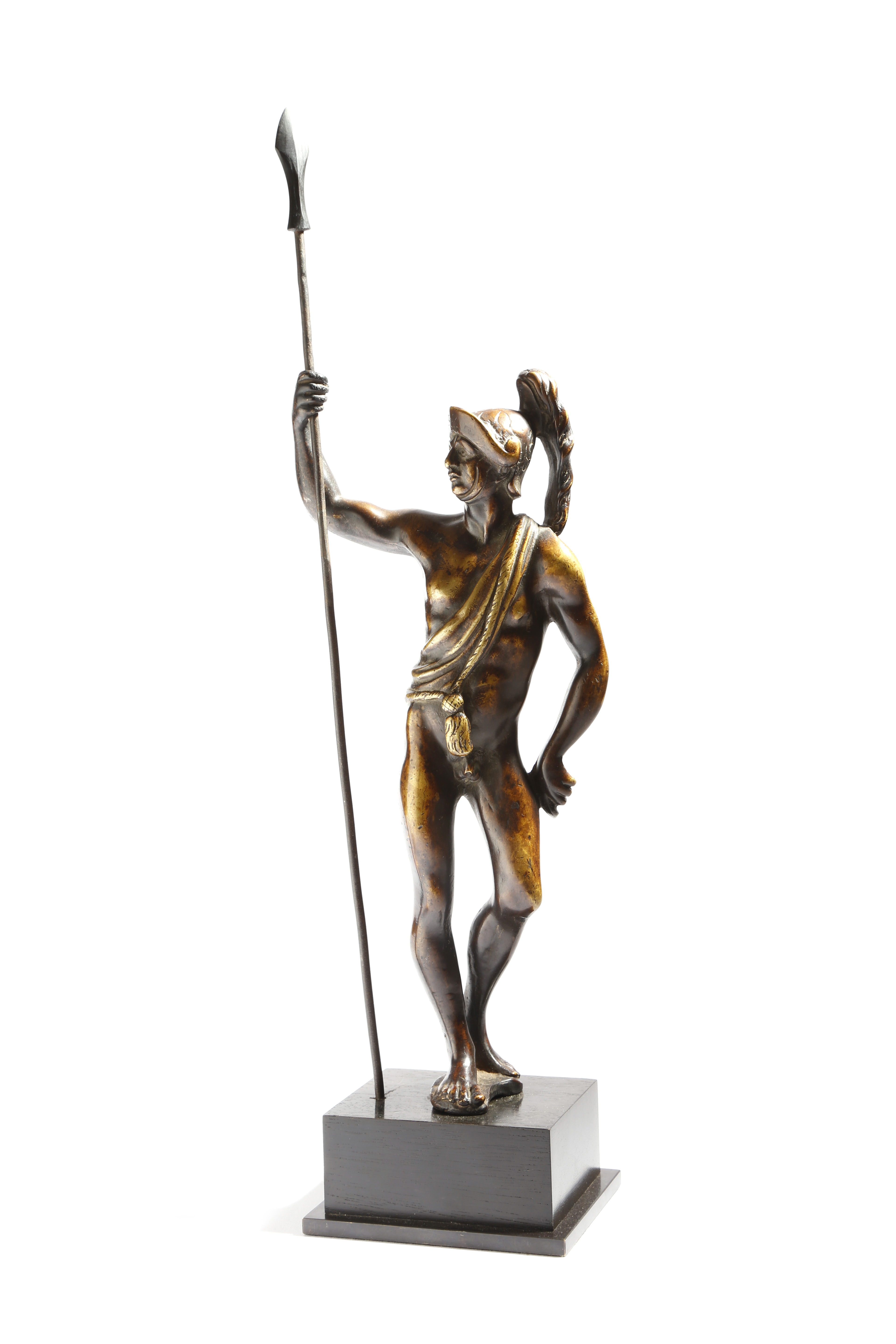 A Flemish bronze figure of Mars the Roman God of War, wearing a plumed helmet and with a sash over his left shoulder, he holds a spear in his right hand, on a later wood and bronze stepped plinth, 17th century, 42.4cm high (overall).