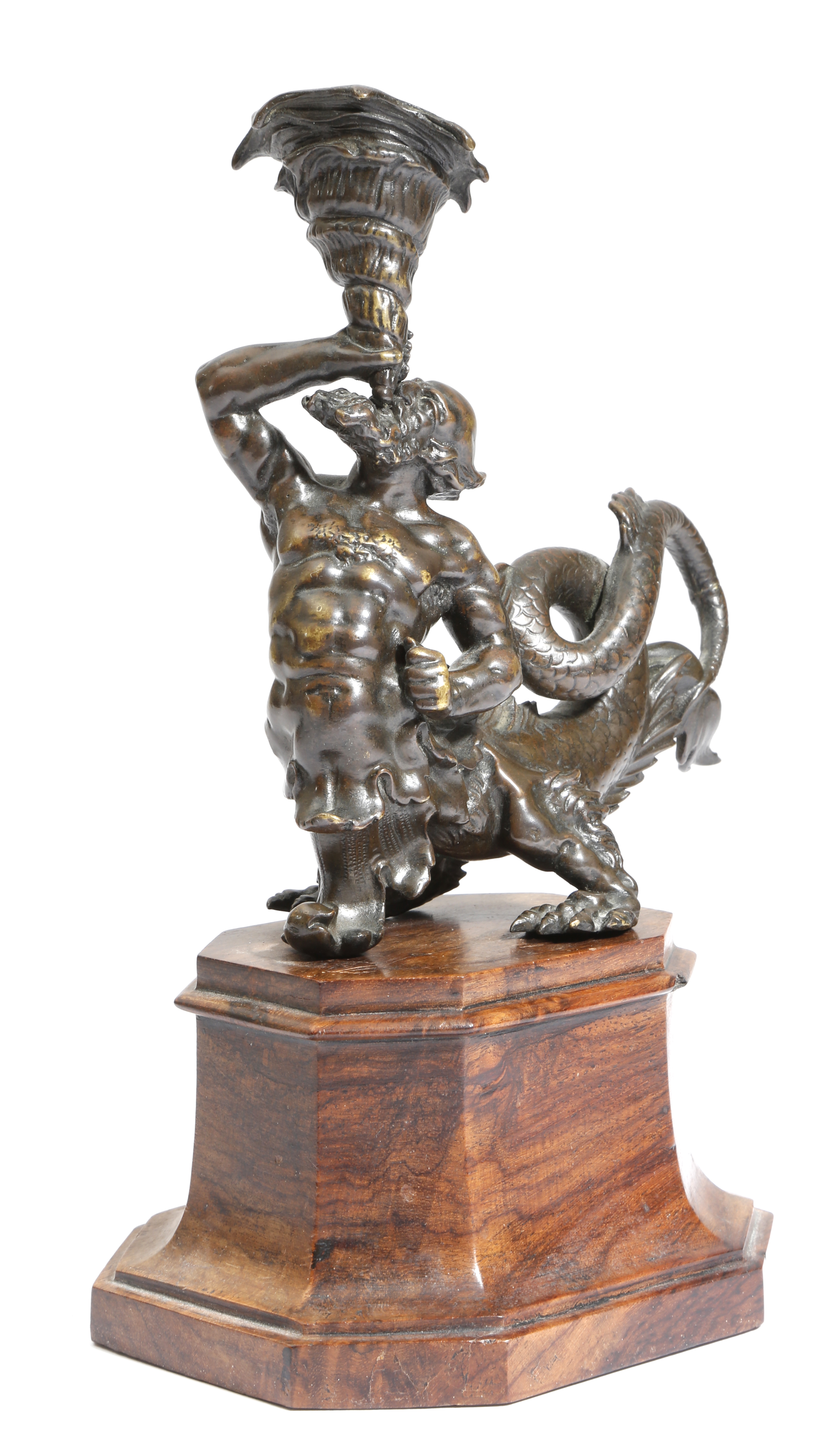 An Italian bronze triton candlestick in the manner of Francesco Fanelli
