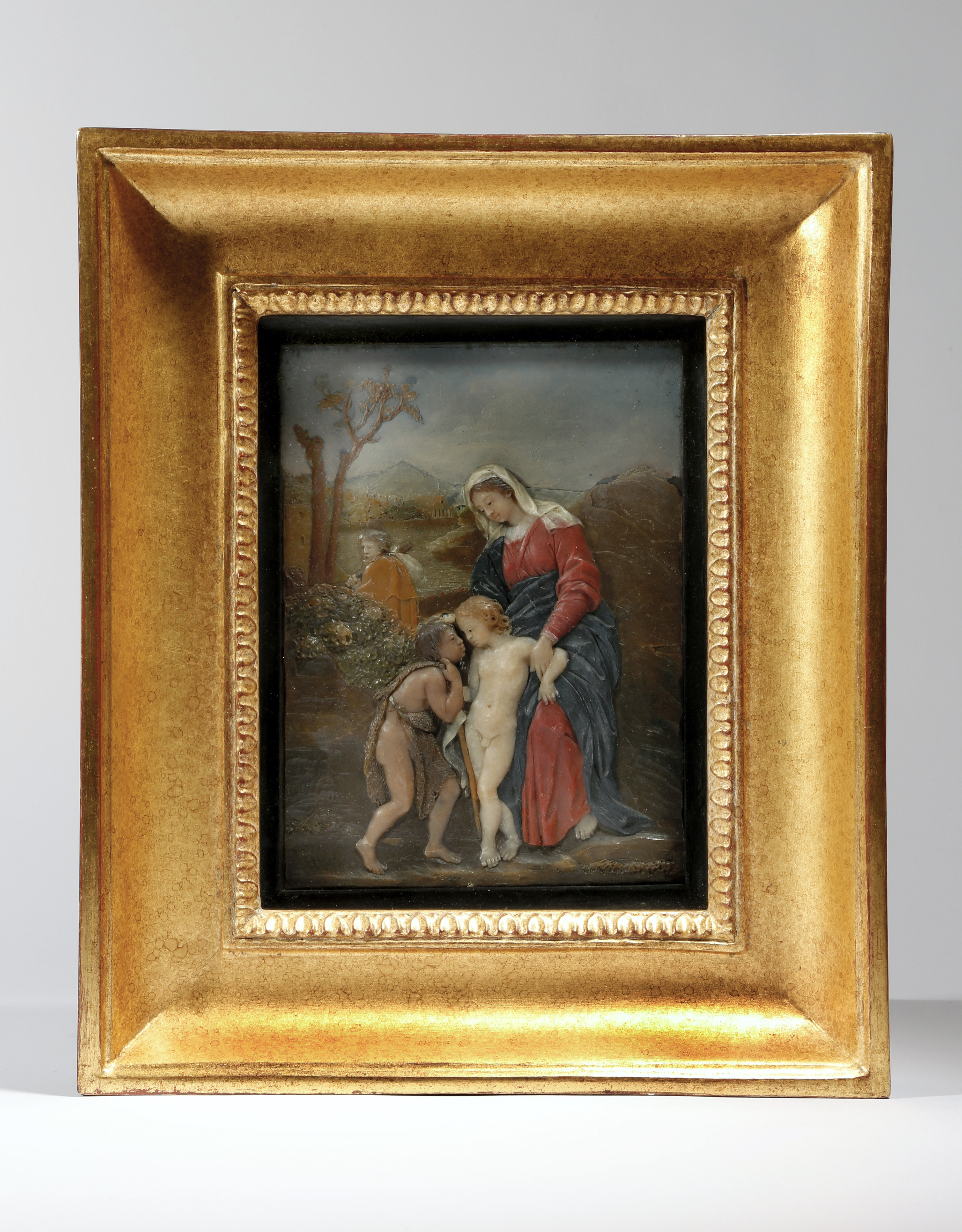Giovanni Francesco Pieri (1699-1773). A mid-18th century Italian polychrome wax relief picture after Raphael's 'Madonna del Passeggio', depicting the Holy Family with the infant St. John the Baptist, indistinctly inscribed to remnants of label to verso, 20 x 14.5cm, in a later giltwood frame.