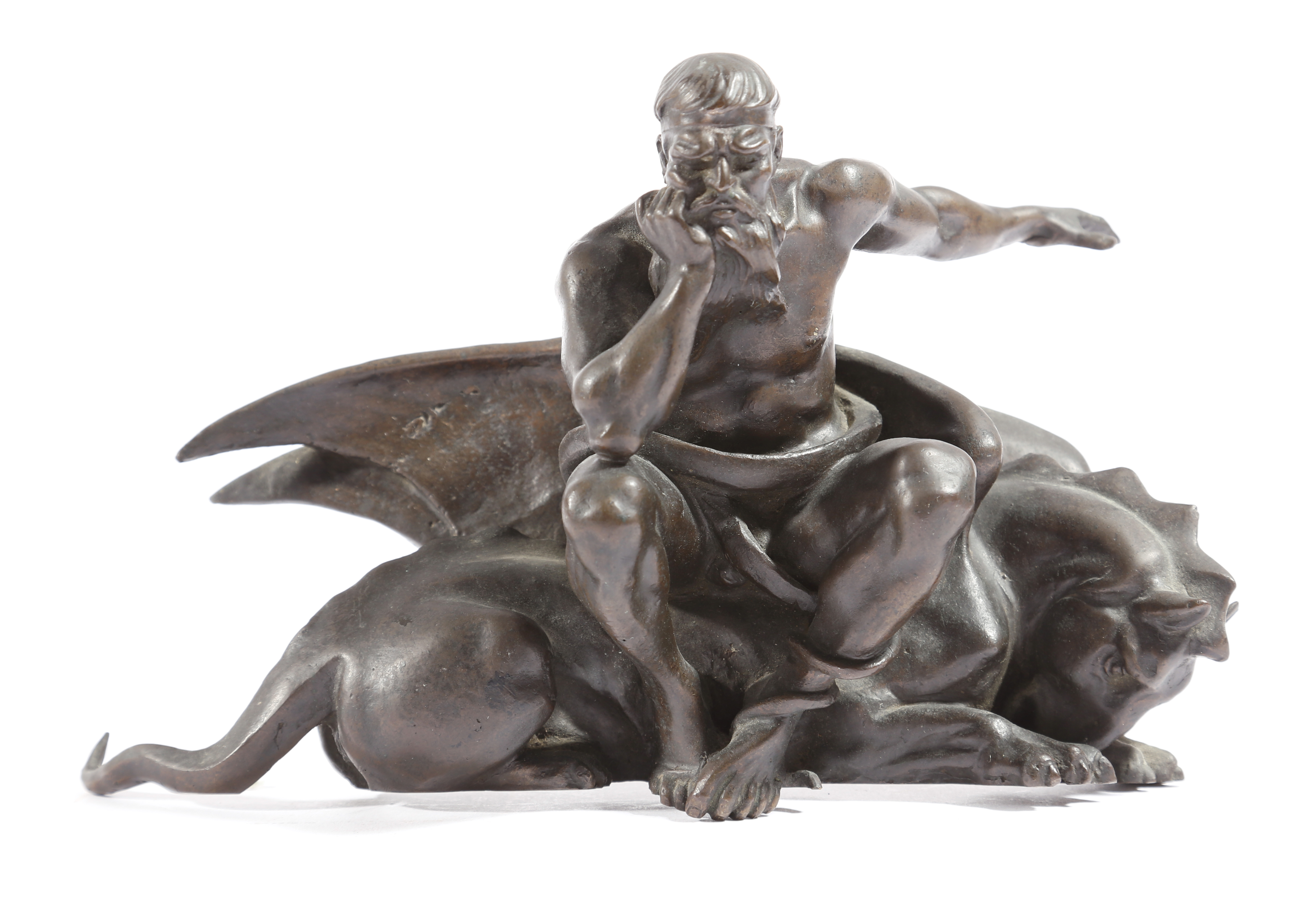 An Arts & Crafts bronze group of Pegasus and Bellerophon, with the Greek hero seated on Pegasus' back, weary after having defeated the Chimera which is entwined round his body, previously mounted, late 19th / early 20th century, 16.3cm high, 27cm wide.