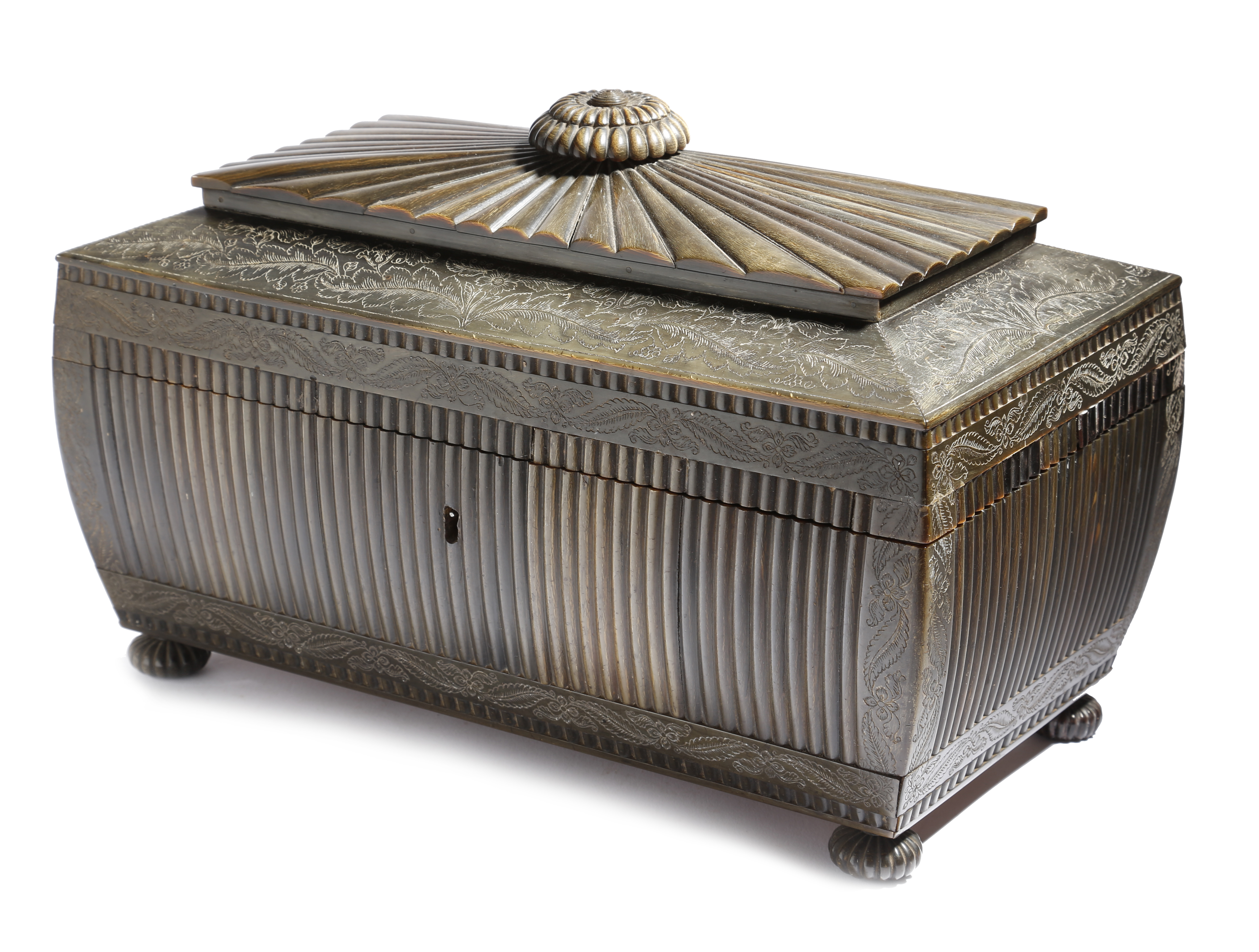 λ A 19th century Anglo-Indian buffalo horn tea chest, of sarcophagus shape, all over engraved with scrolling leaves and flowers, with panels of ribbed decoration, the hinged lid with a gadrooned finial, revealing a sandalwood and ivory interior, the ivory with lac floral bands, with a pair of lift-out hinged canisters flanking a cut-glass sugar bowl, on nulled flattened bun feet, Vizagapatam, c.1830-50, 23.5cm high, 36.2cm wide, 20cm deep.