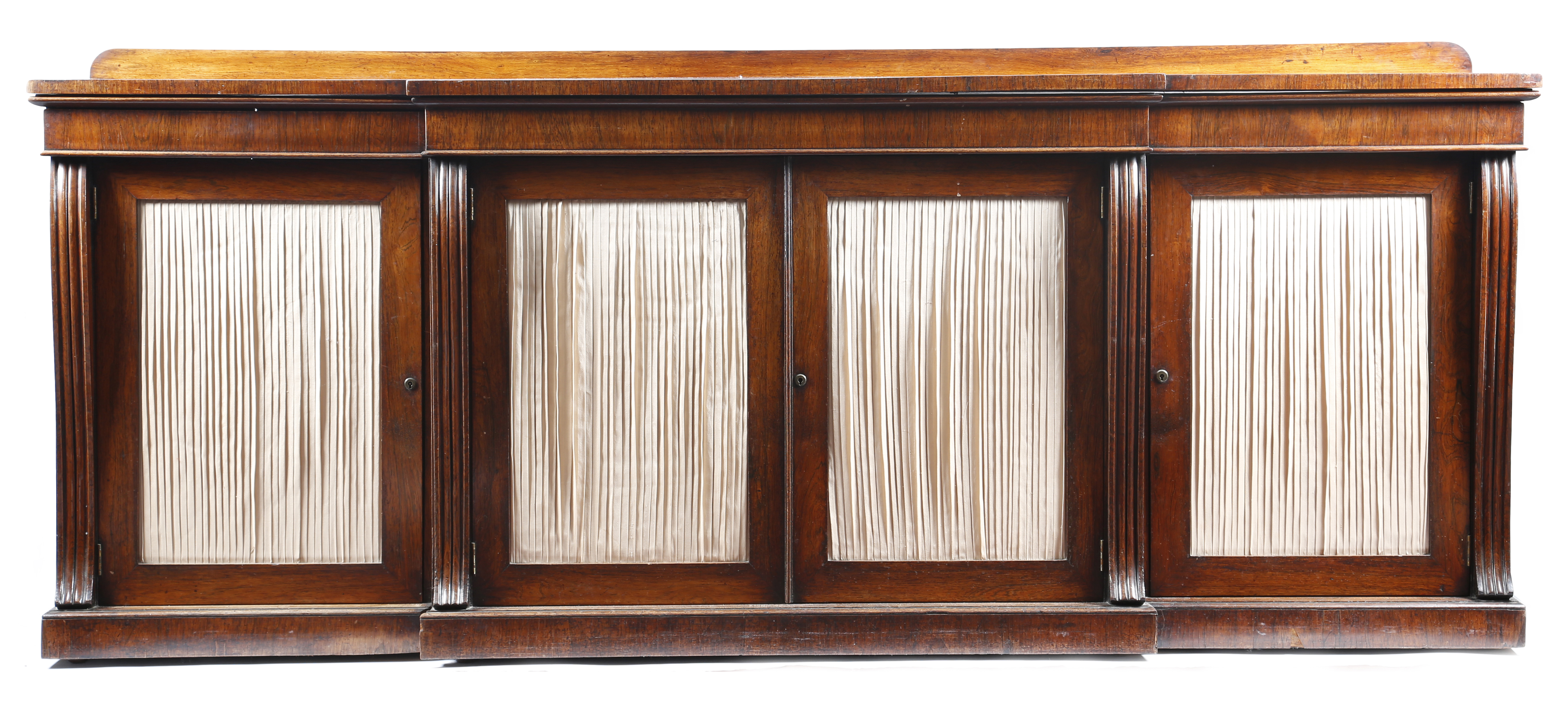 λ A Regency rosewood breakfront side cabinet, the top with a raised back, above two frieze drawers and three cupboards with pleated fabric doors enclosing a shelf, flanked by fluted corbels, 95.8cm high, 244cm wide, 56cm deep.