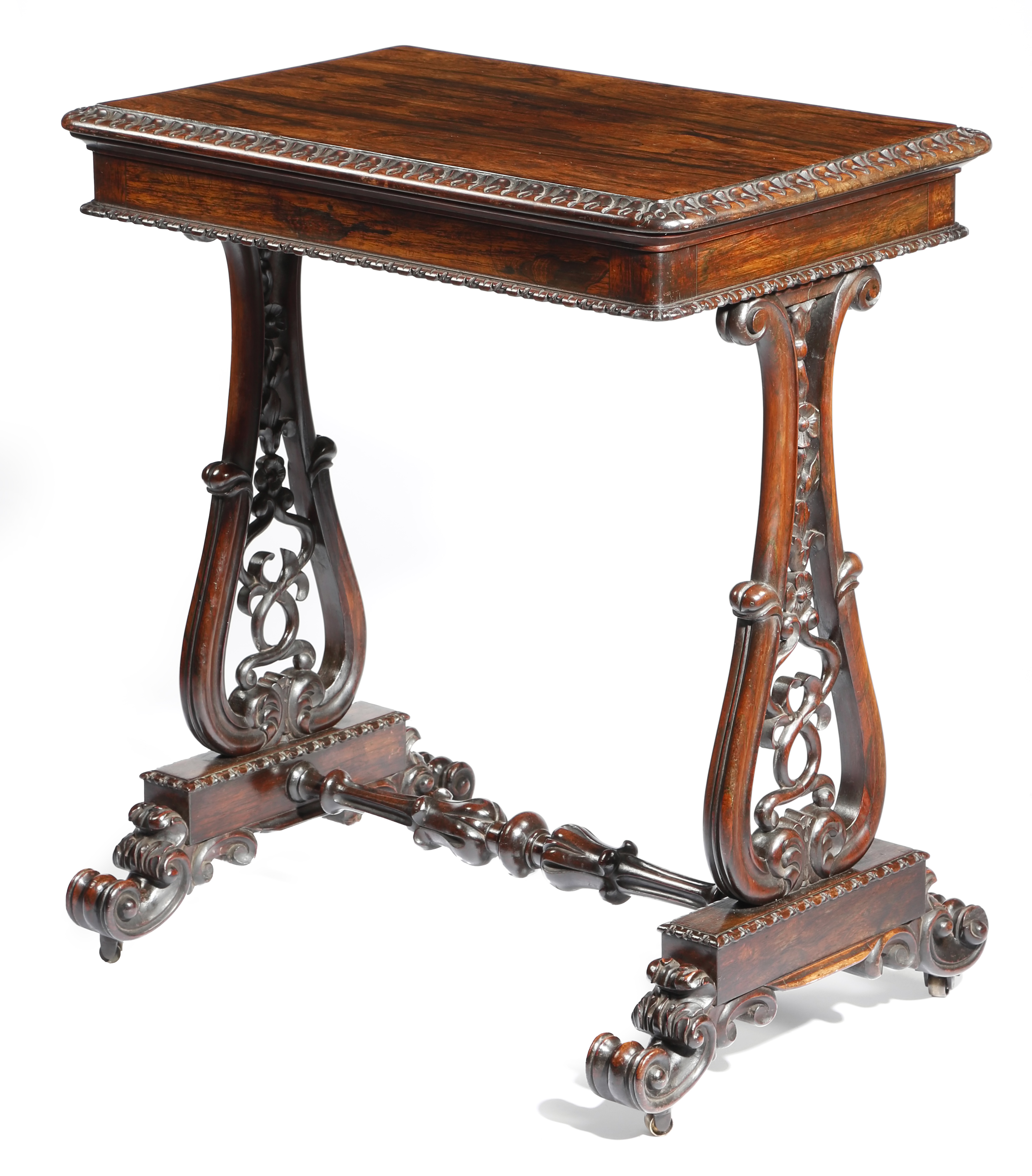 λ A William IV rosewood occasional table, the rectangular top with a leaf carved edge, above flower and lappet carved lyre supports united by a stretcher, on scroll feet and brass castors, 78cm high, 68.7cm wide, 48cm deep.