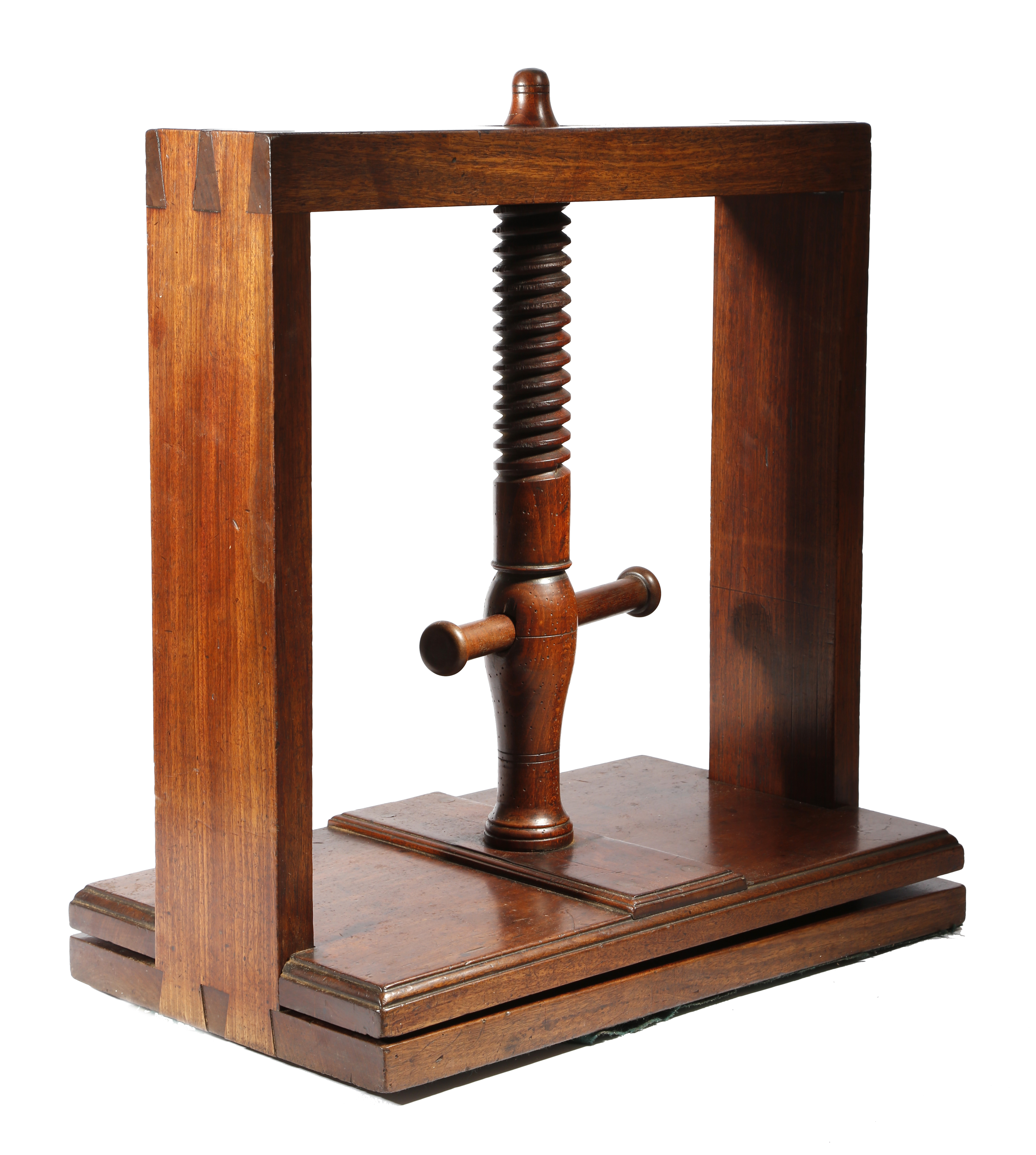 An early 19th century mahogany linen / napkin press attributed to Gillows, with a beechwood screw stem and a turned handle, 56.8cm high, 54cm wide, 32.3cm deep.