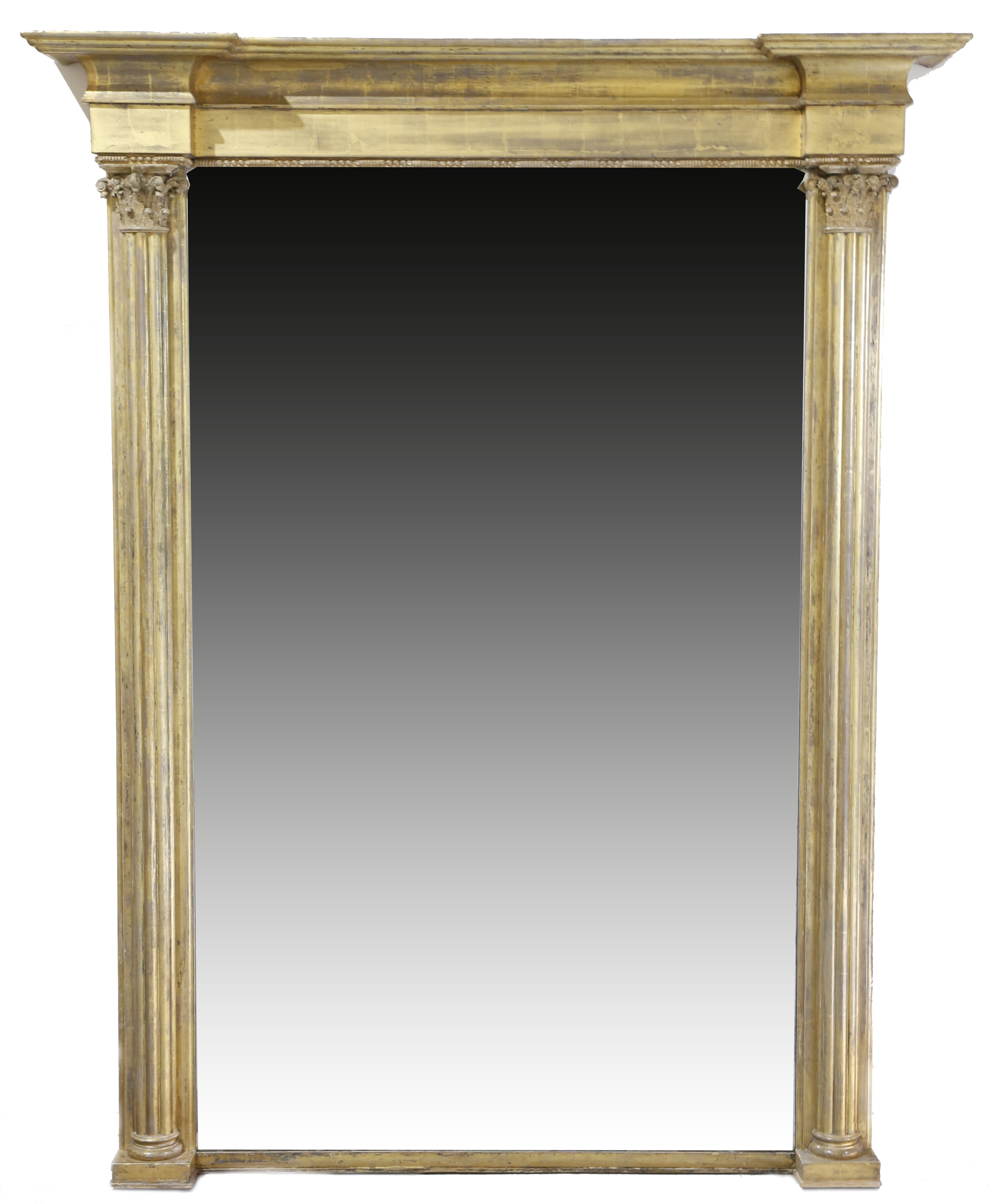 A large mid-19th century giltwood overmantel mirror, the rectangular plate flanked by cluster columns with Corinthian capitals, with an inverted breakfront frieze, 221 x 174cm.