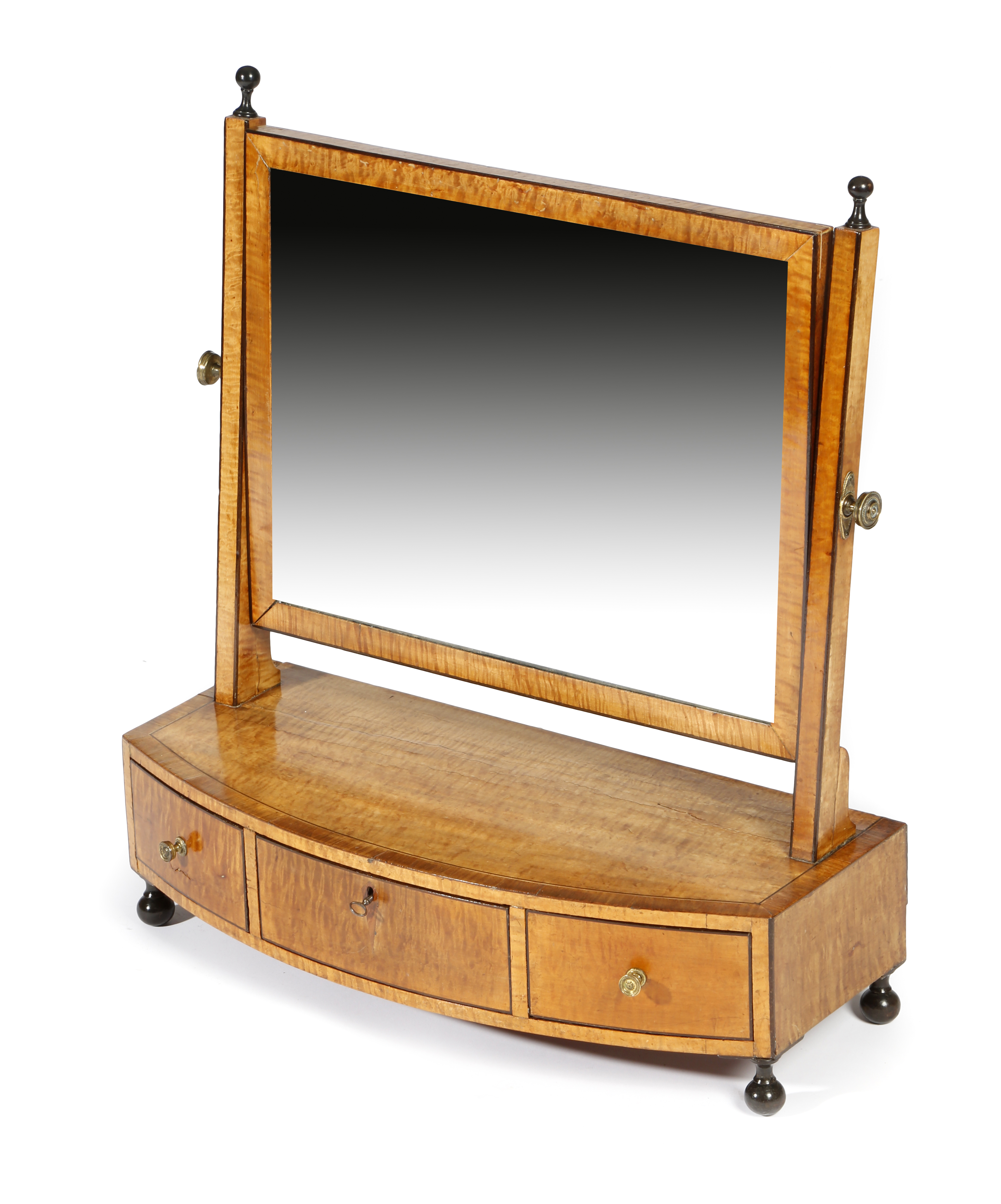 A Regency satinwood dressing table mirror, with ebonised stringing, the bowfront base fitted with three drawers, on ball feet, 56.8cm high, 51.5cm wide, 22cm deep.