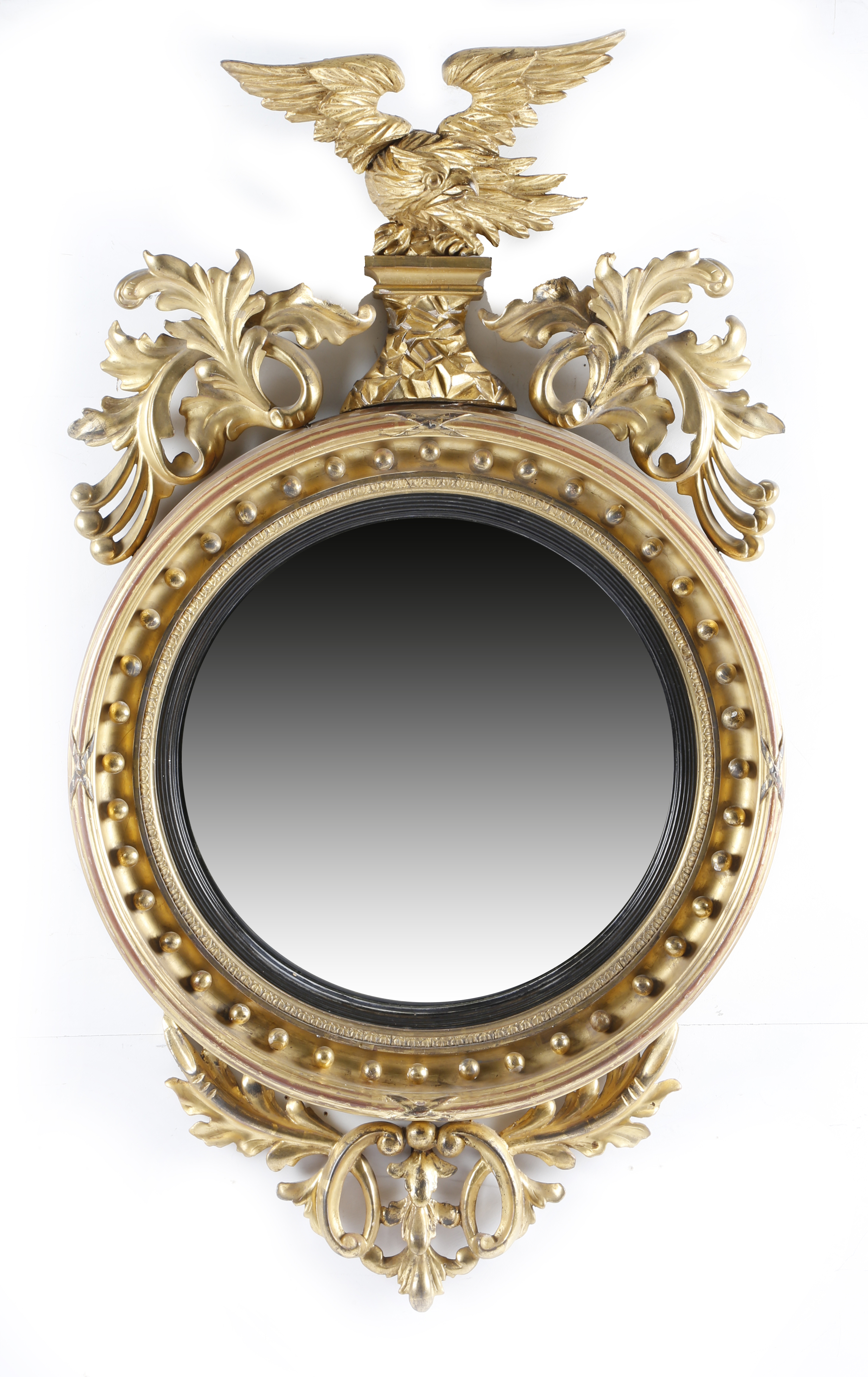 A 19th century giltwood and gesso convex wall mirror, the circular plate within an ebonised reeded slip and a ball decorated frame carved with ribbons, with an eagle and rockwork surmount flanked by leaves, the base with 'C' scrolls and foliage, 103 x 63cm.