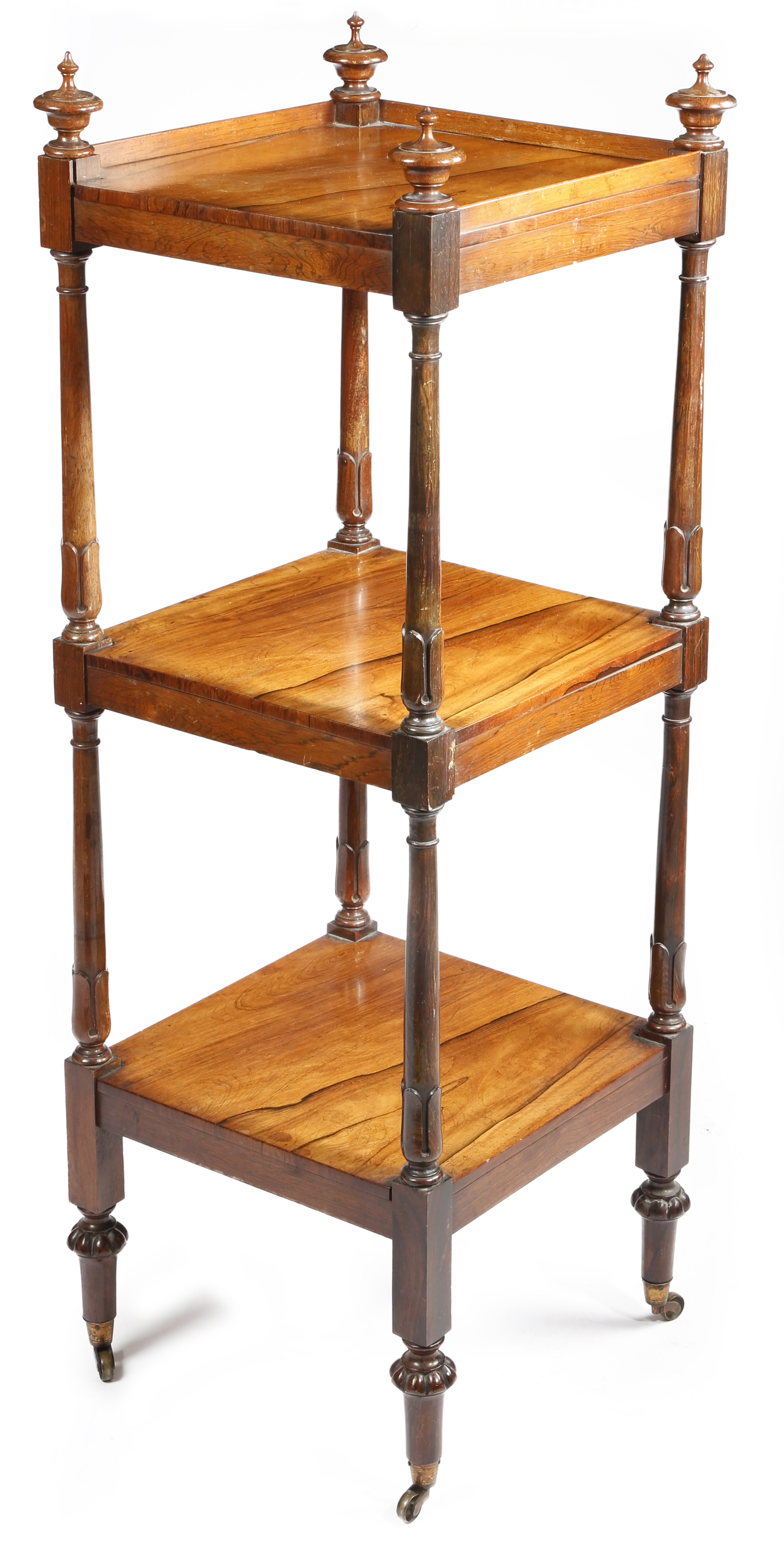 λ A William IV rosewood three-tier whatnot, with urn finials and lappet carved turned supports, on brass castors, 113cm high, 40cm wide, 40.3cm deep.