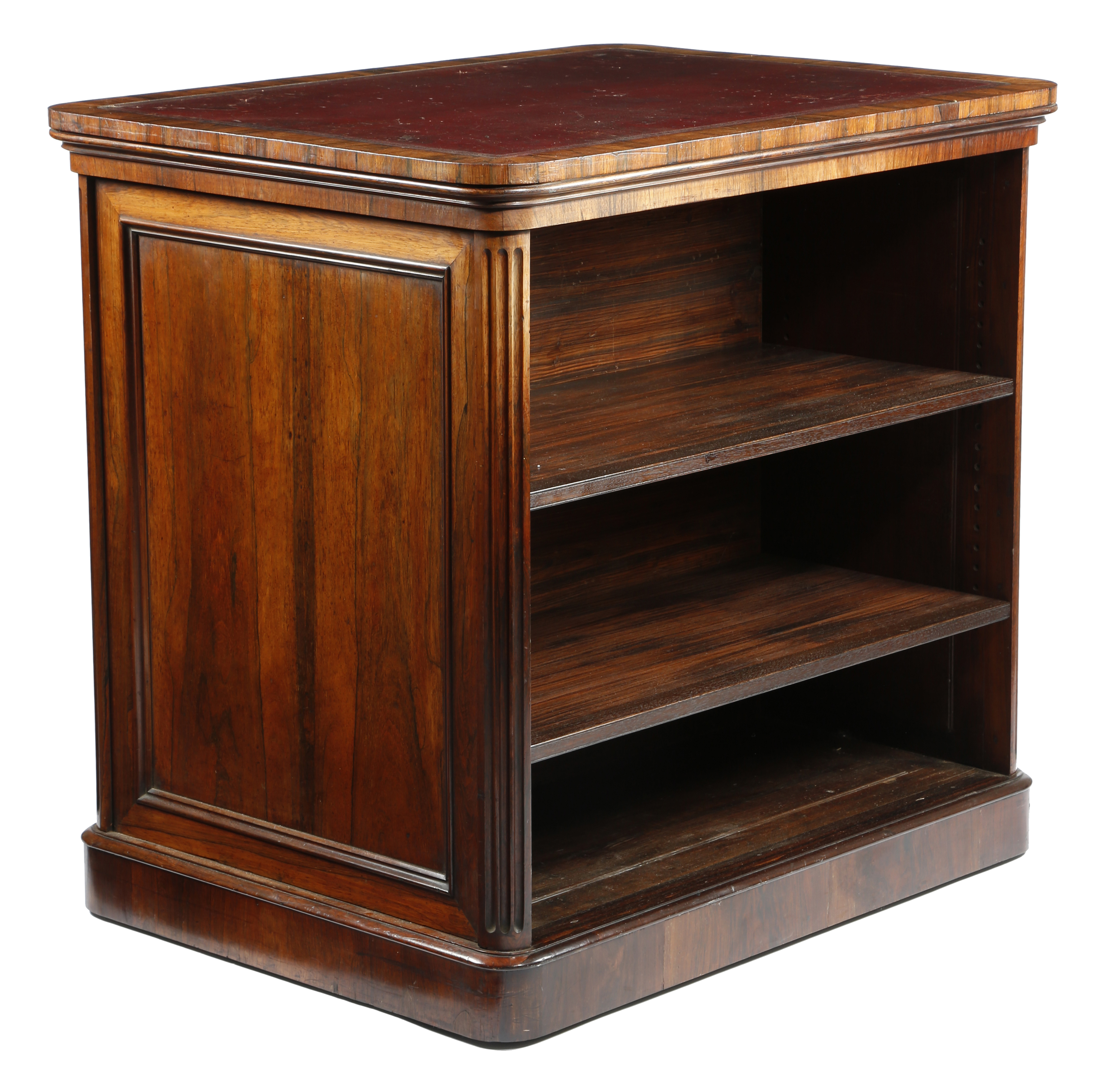 λ An early Victorian rosewood double sided library bookcase, the top inset with gilt tooled red leather, with two adjustable shelves to either side, with panelled ends and fluted corners, on brass castors, the iron mount stamped 'COPE'S PATENT', 108cm high, 106cm wide, 79.4cm deep.
