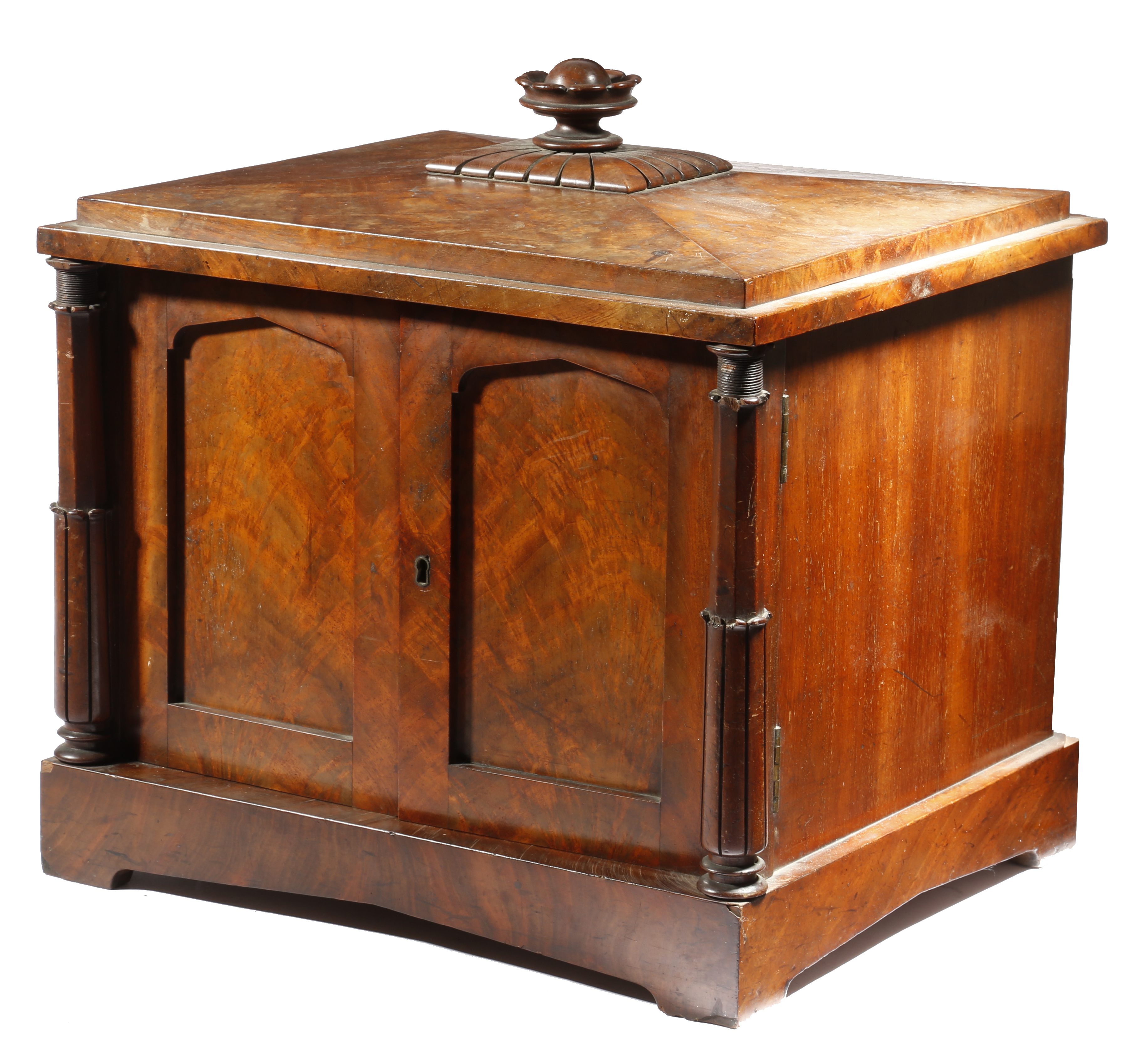 λ A George IV mahogany table coin collector's cabinet, with a stylised urn finial above a pair of arched panelled doors, flanked by faceted and lappet carved columns, the interior with forty-two burr veneered and graduated drawers, the majority with coin apertures and with ivory knob handles, 39.4cm high, 38.3cm wide, 32.6cm deep.