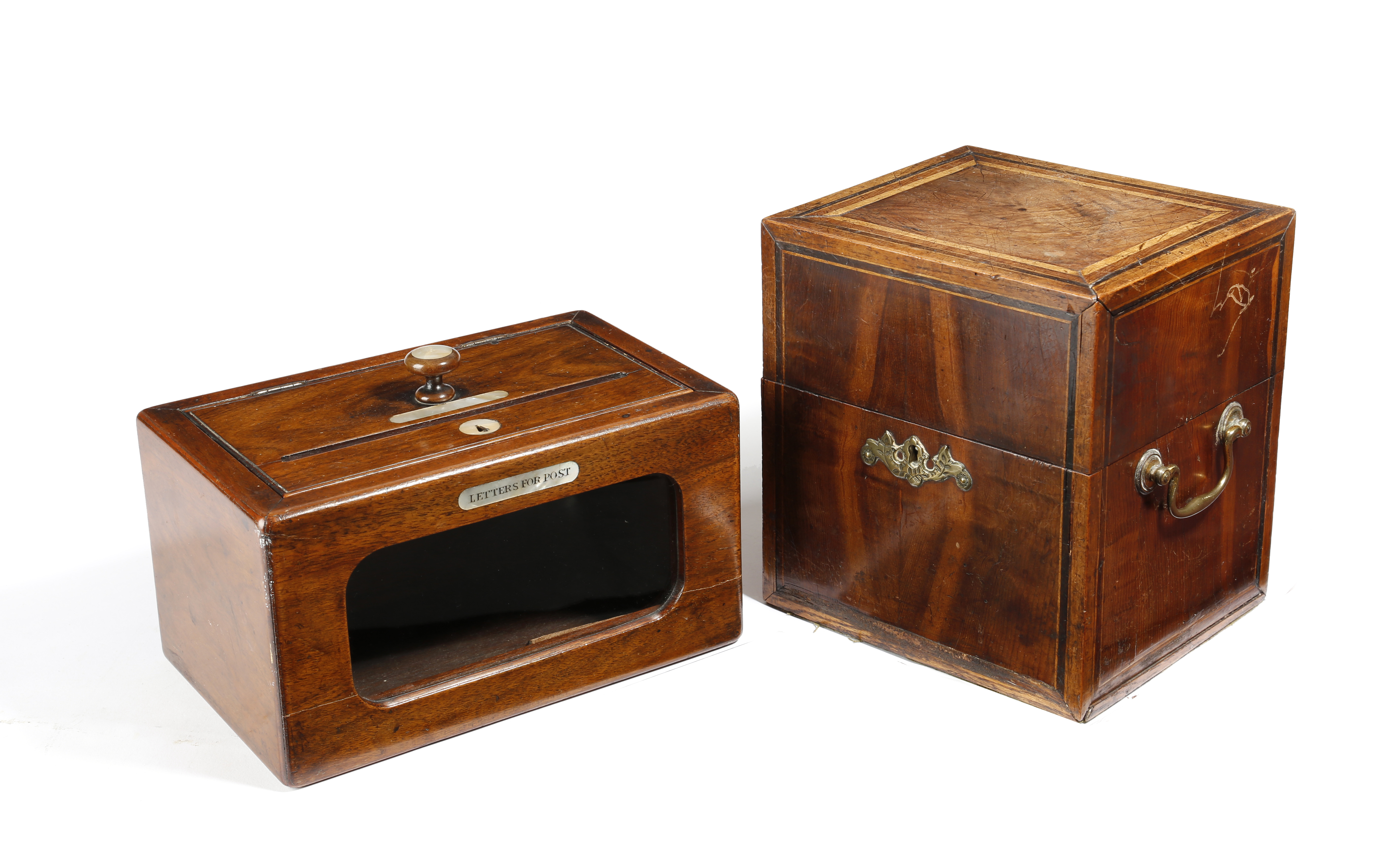 A Victorian walnut country house letter box, with mother of pearl inlay, the hinged lid with a single slot and turned knob handle, the front with a glass panel and inscribed 'LETTERS FOR POST', 24.5cm wide, together with a George III decanter box, decorated with yew panels, the interior with three glass decanters and stoppers, 20.8cm high. (2)