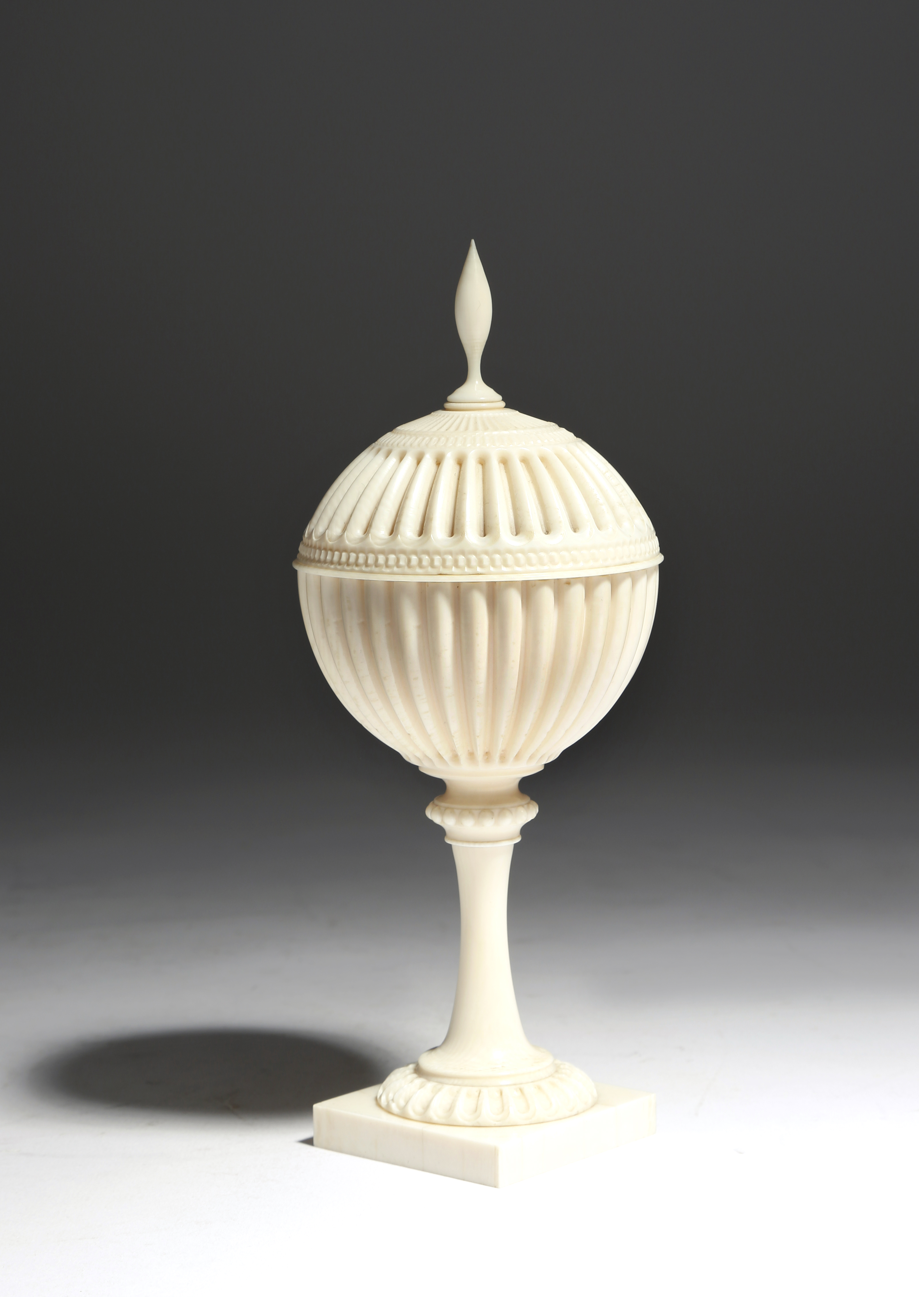 λ An early 19th century ivory ornamentally turned urn and cover, with ribbed and fluted decoration, with a slender stem and square base, 19.5cm high.