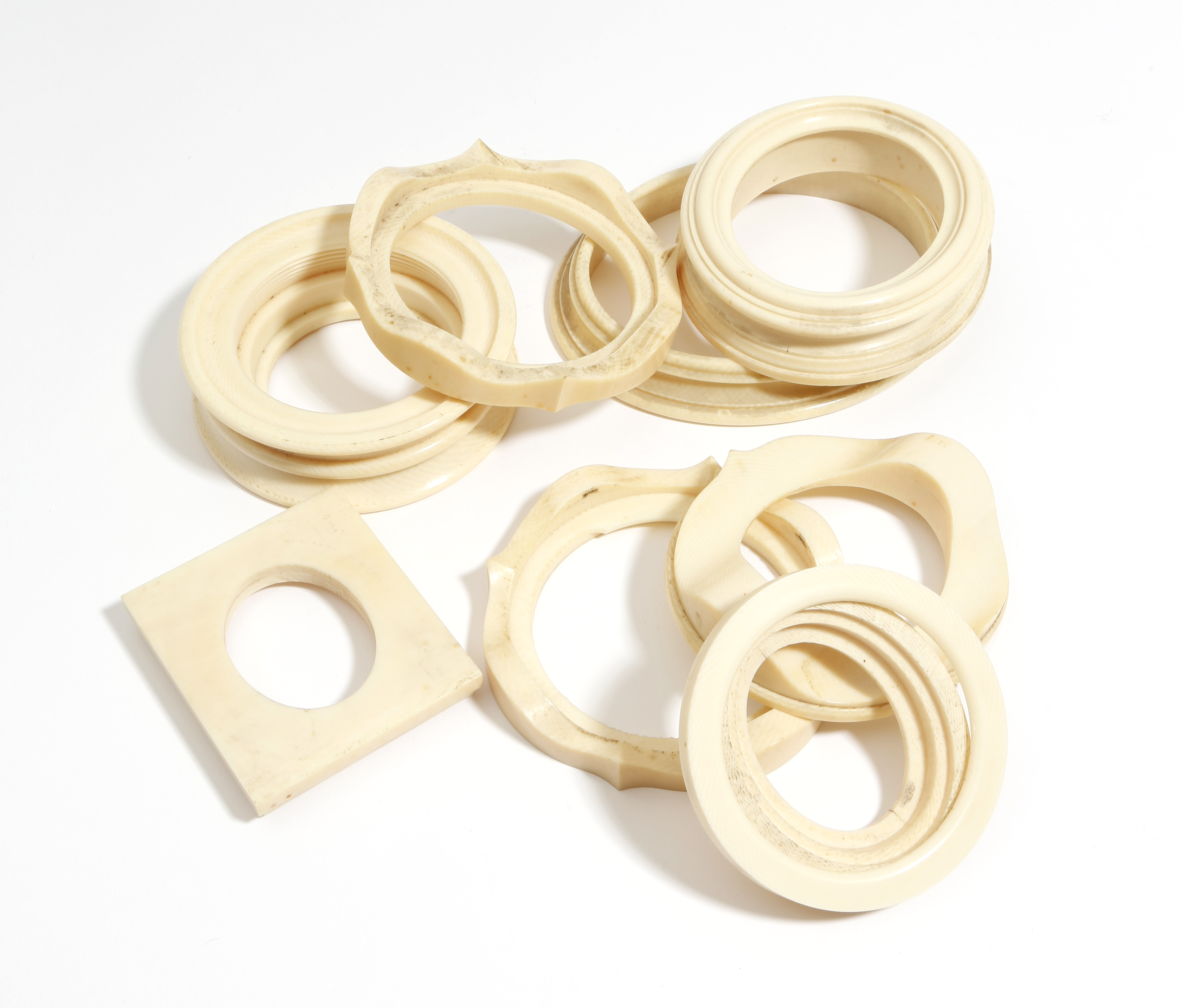 λ Lady Gertrude Eleanor Crawford (1868-1937). Nine ornamentally turned ivory stands and frames, of various shapes, 11.3cm (max). (9)