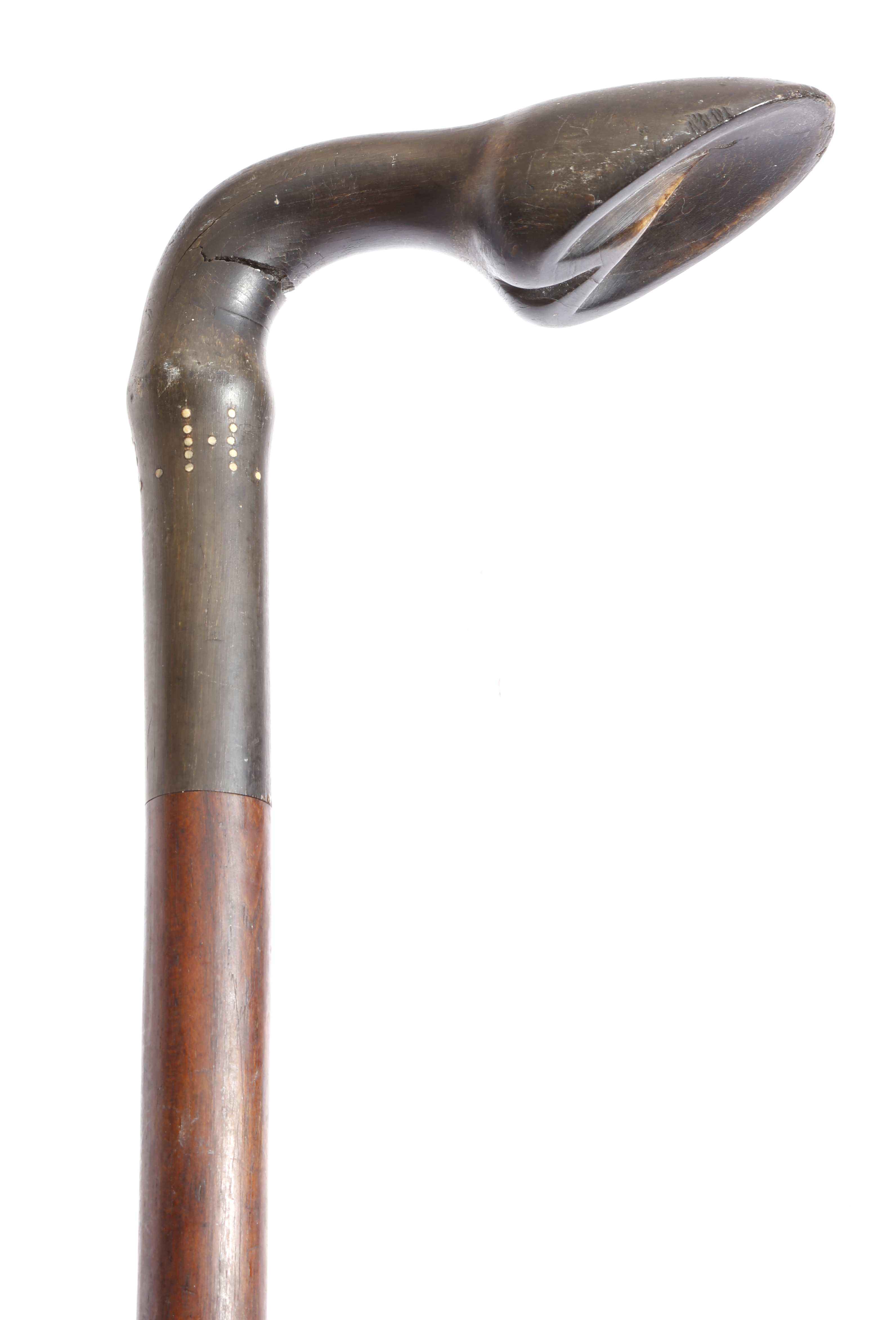 λ A horn walking cane, possibly rhinoceros, the handle carved with a hoof, with ivory dot initials 'F. R. H.', with a hardwood shaft, early 20th century, 90.3cm long.