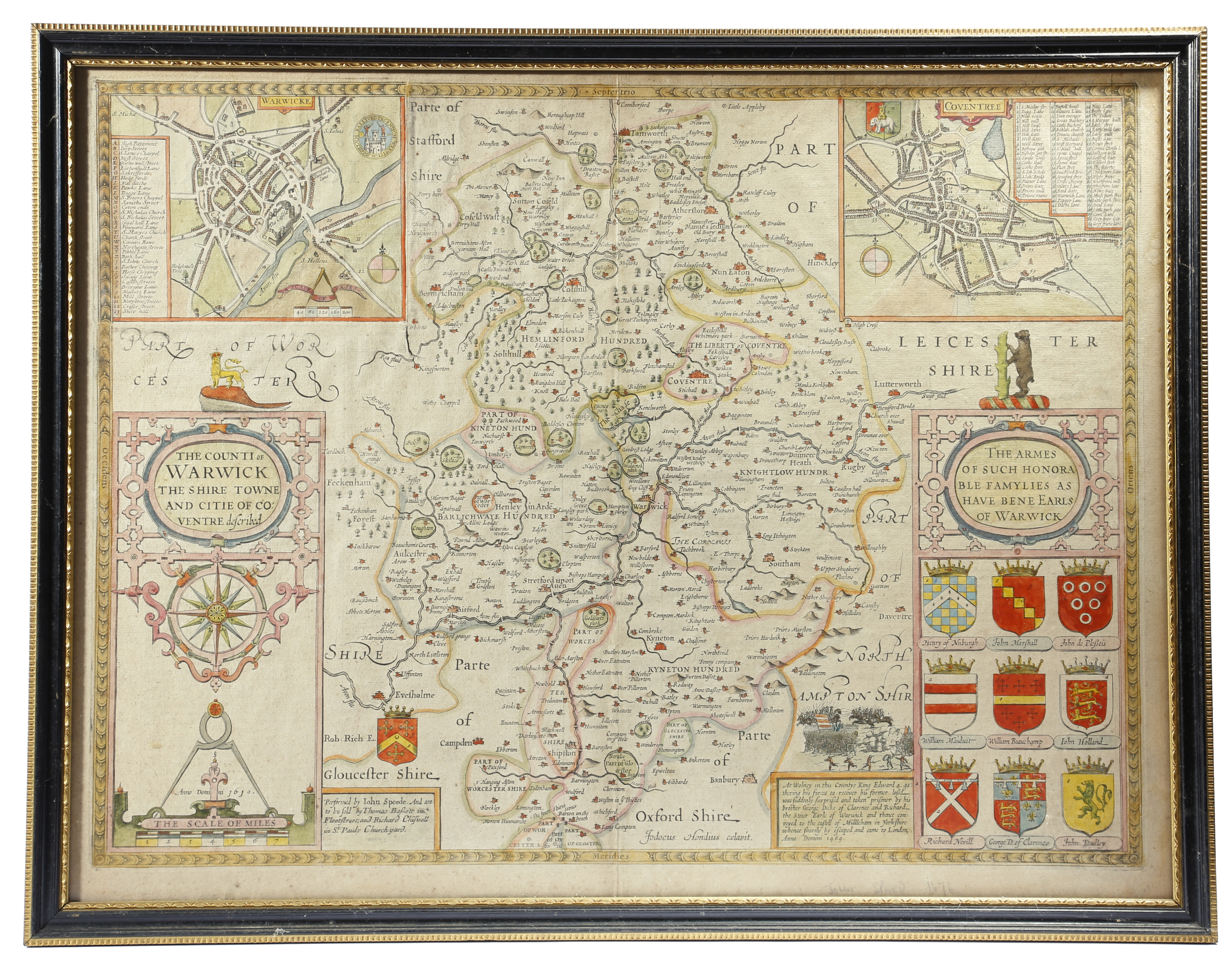 John Speed (1552-1629). 'WARWICKSHIRE', a hand-coloured engraved map, titled 'THE COUNTI OF WARWICK THE SHIRE TOWNE AND CITIE OF COVENTRE described', with two inset plans of Warwick and Coventry, dated '1610', English text to verso, 40.5 x 53cm, in a later glazed double-sided ebonised and gilt frame.