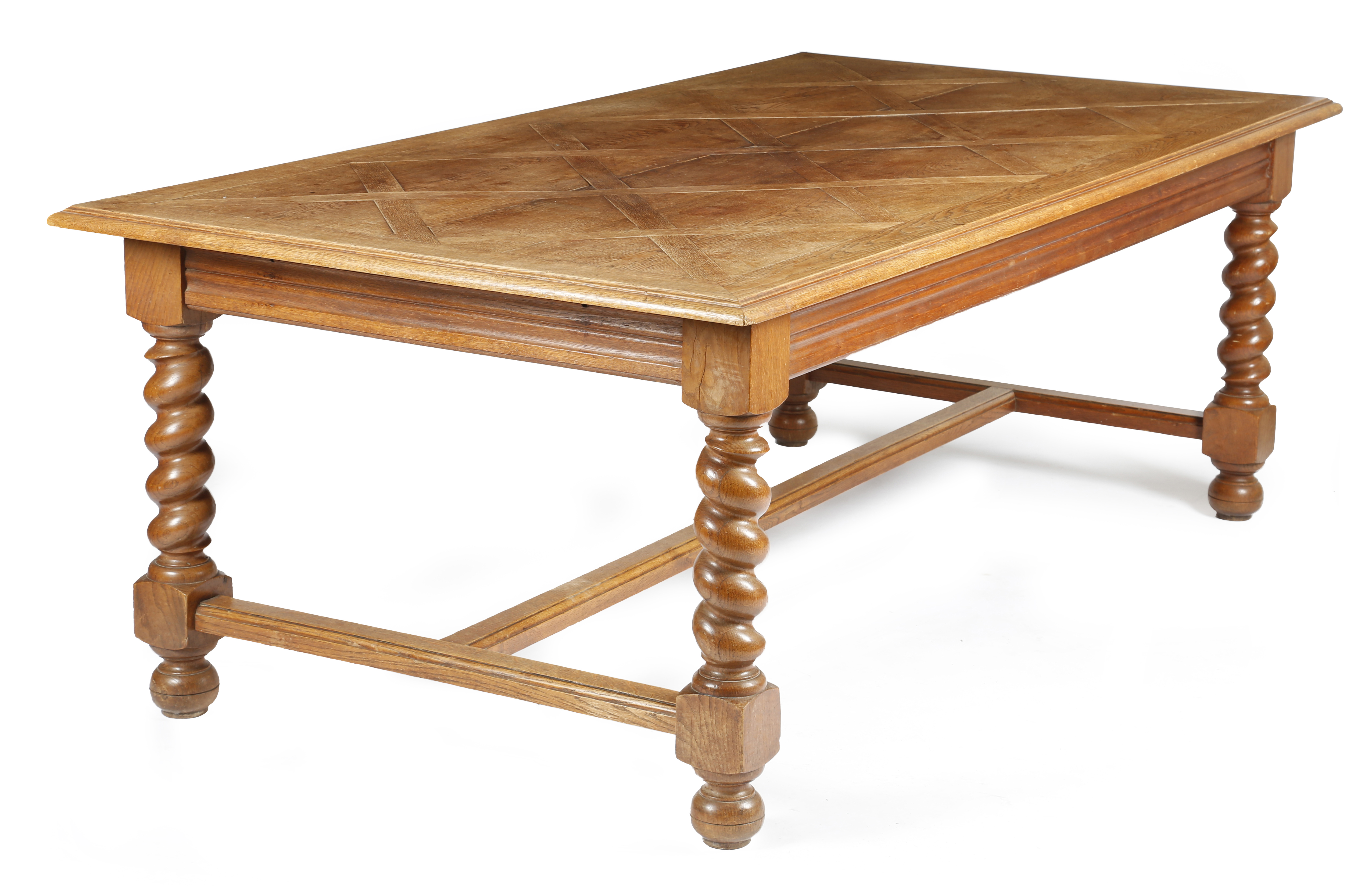 A late Victorian oak refectory style dining table in the manner of Howard & Sons, the rectangular top with chequered parquetry decoration, with a moulded edge, above block and spiral twist legs united by an 'H' stretcher, on ball feet, 74.7cm high, 210.5cm long, 109.5cm wide.