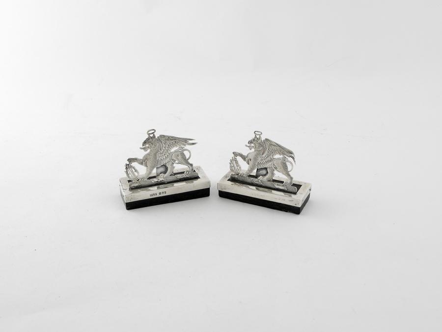 Two late Victorian heraldic place card holders, on mounted wooden bases; one unmarked, one by Olivant and Batsford, London 1900, 2.45in (6cm) high. (2)
