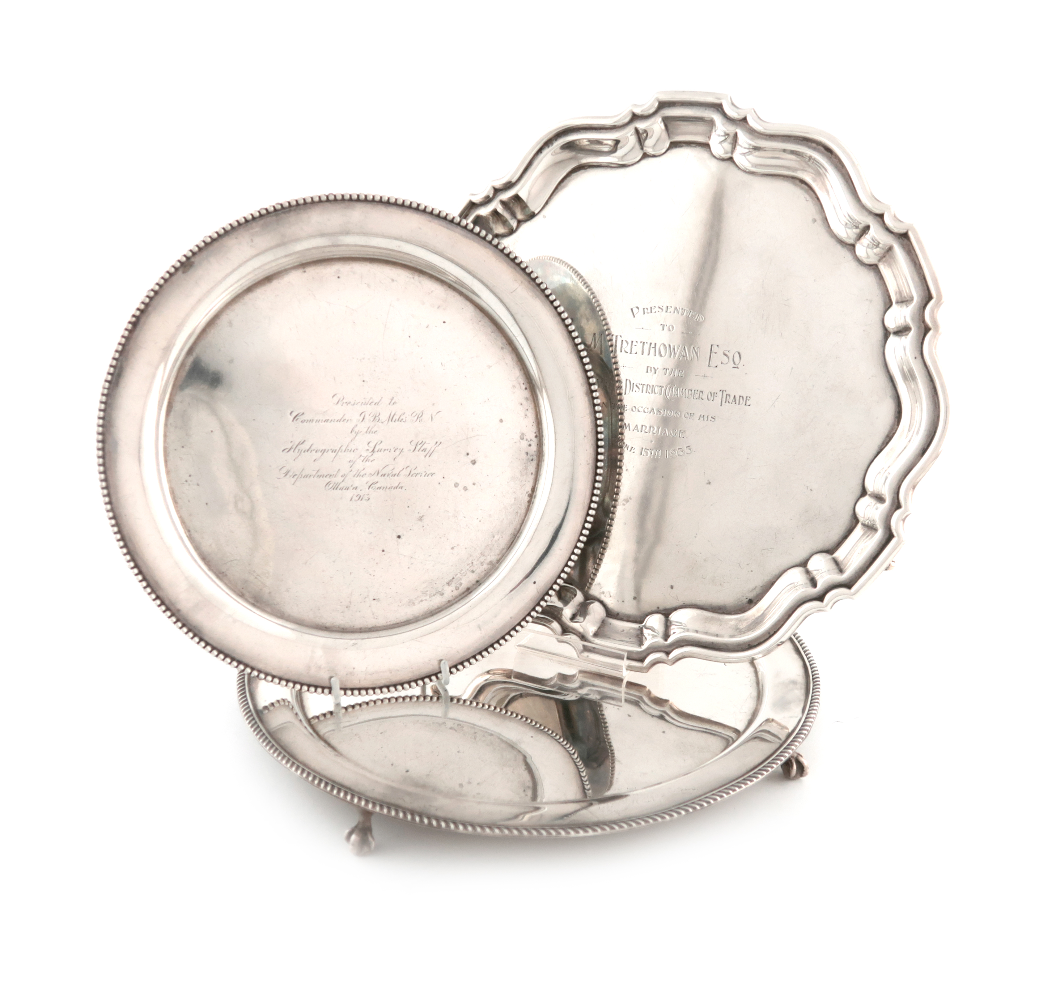 circular form, moulded border, with an inscription, plus a Canadian salver inscribed 'Presented to Commander J.B. Miles R.N, by the Hydrographic Survey Staff of the Department of Naval Service, Ottawa, Canada 1913', and another salver of circular form, gadroon border, marks worn, approx. weight 56.5oz. (3)