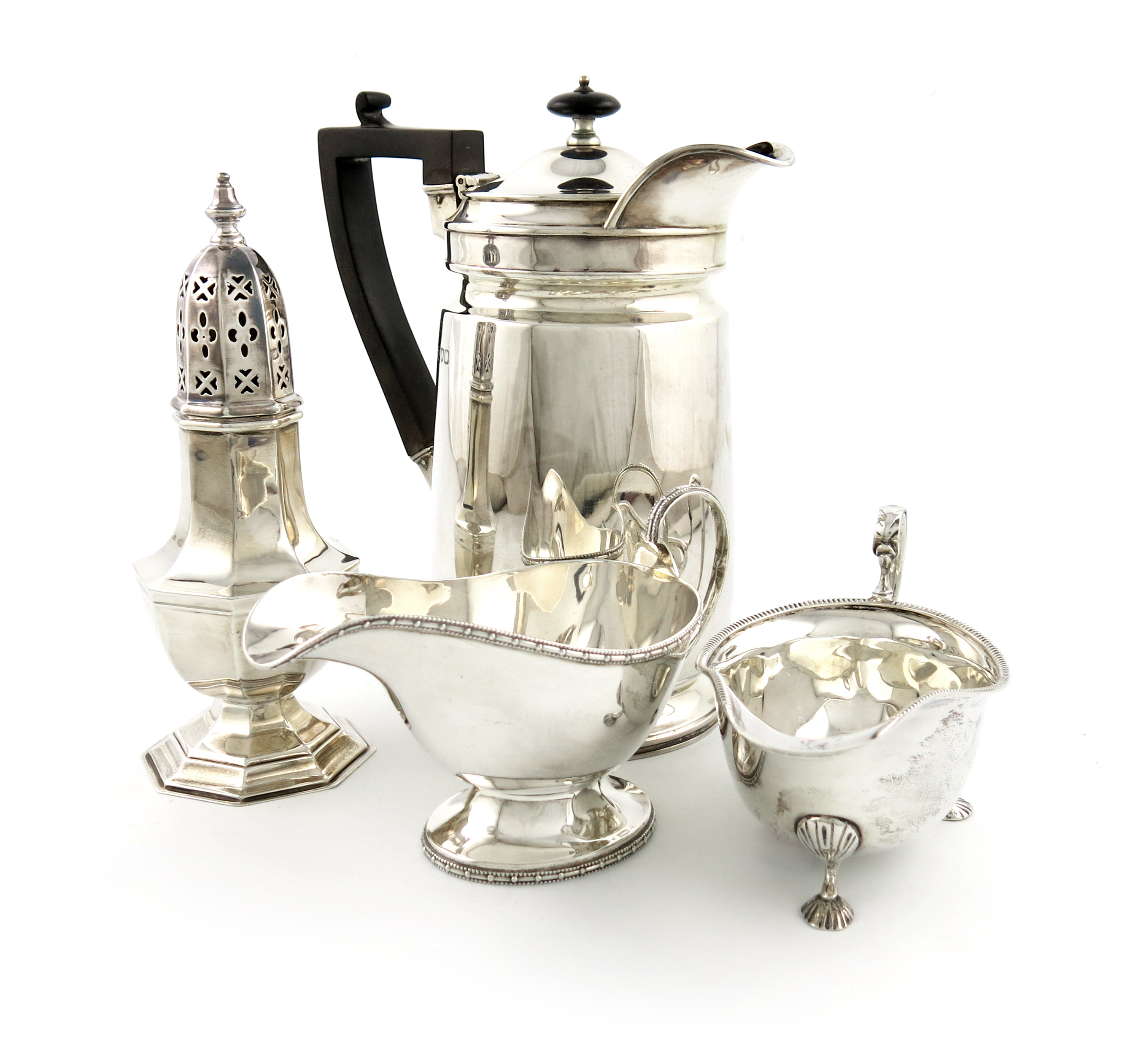comprising: an Edwardian hot water pot, by James Parkes, London 1903, circular tapering form, plus a sugar caster and two sauce boats, approx. weight 35.5oz. (4)