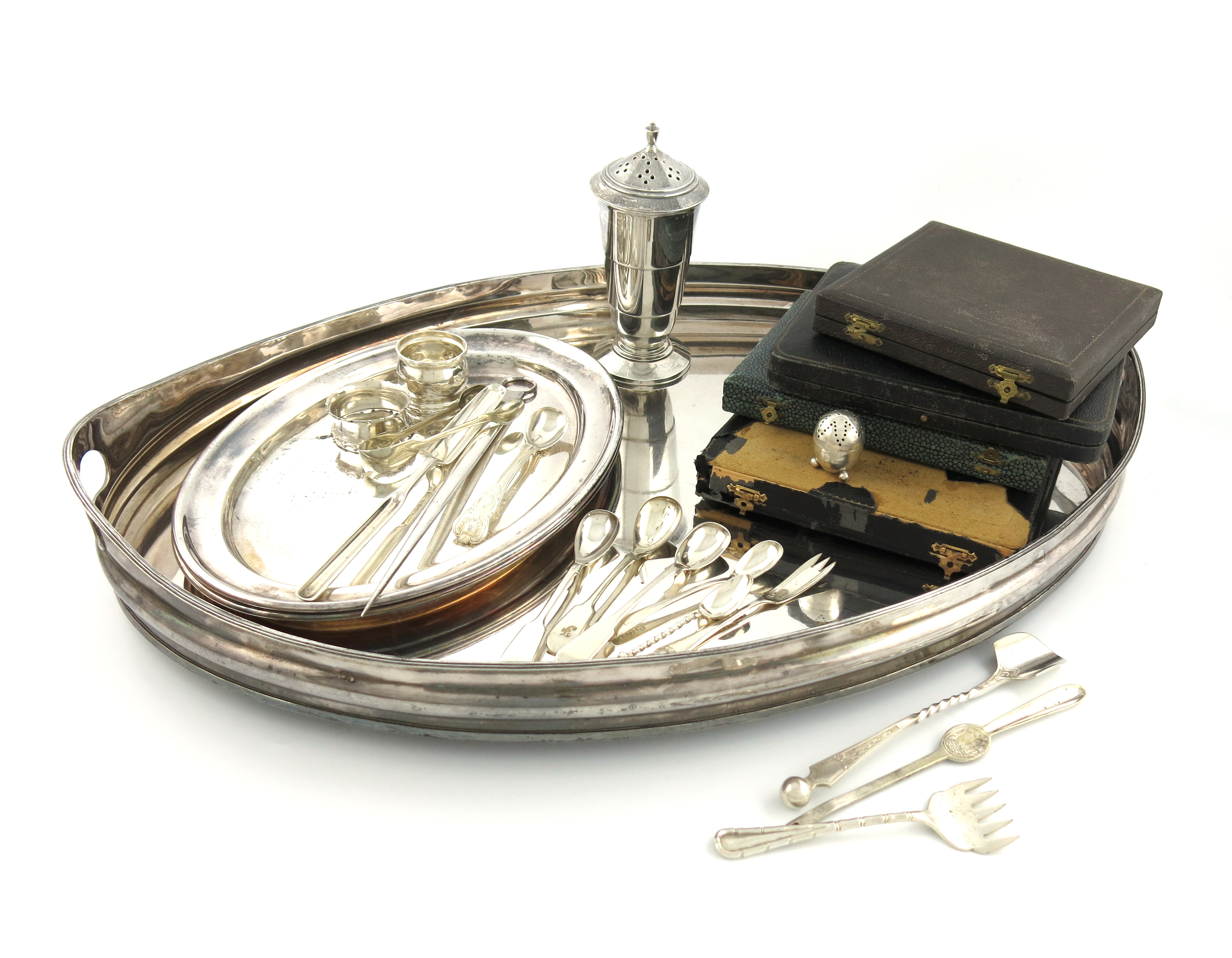 comprising silver items: a George III marrow scoop, London 1808, two napkin rings, three mustard spoons, a cased set of six grapefruit spoons, a cased set of spoons, a cased set of knives, a pepper pot, and a spoon, plus electroplated items including an oval gallery tray, a sugar caster, and two dishes, approx. weighable 12oz. (qty)