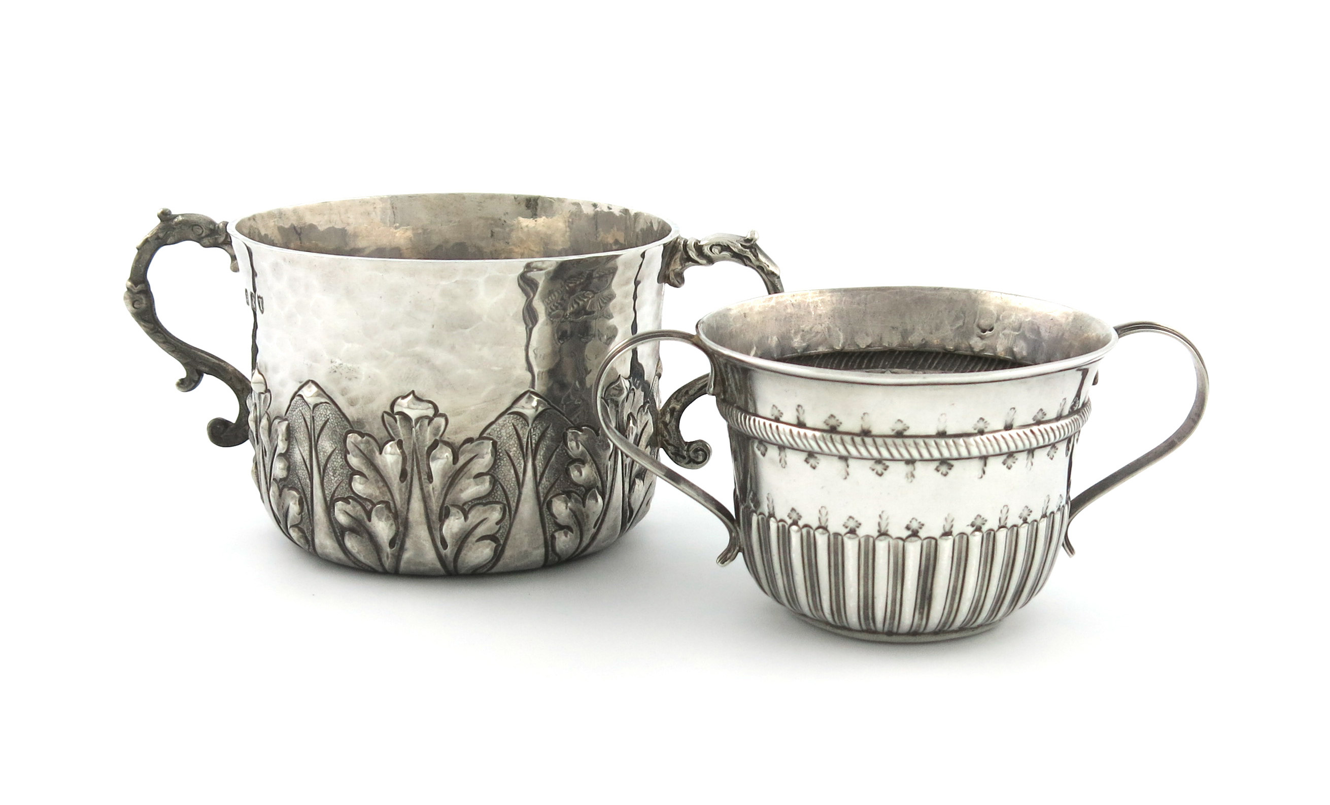 circular form, embossed acanthus leaf decoration, scroll handles, height 7cm, plus a George II small two-handled porringer, by Fuller White, London 1749, circular form, part-fluted decoration, rope-work border, approx. weight 8oz. (2)