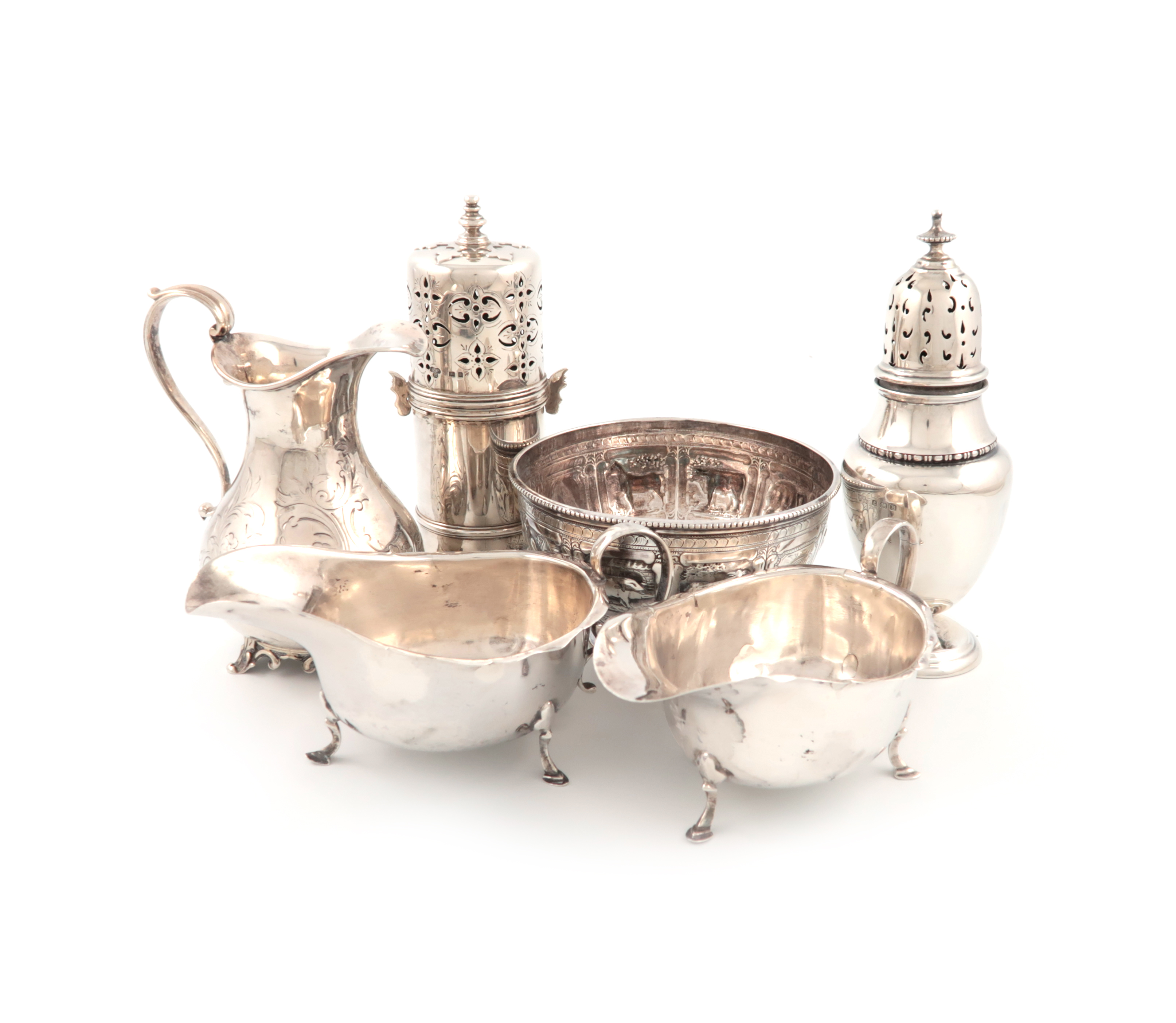 comprising: a sugar caster of lighthouse form, London 1926, a cream jug, London 1853, a bowl embossed with animals, London 1877, a pair of sauce boats, and a sugar caster, approx. weight 24oz. (6)