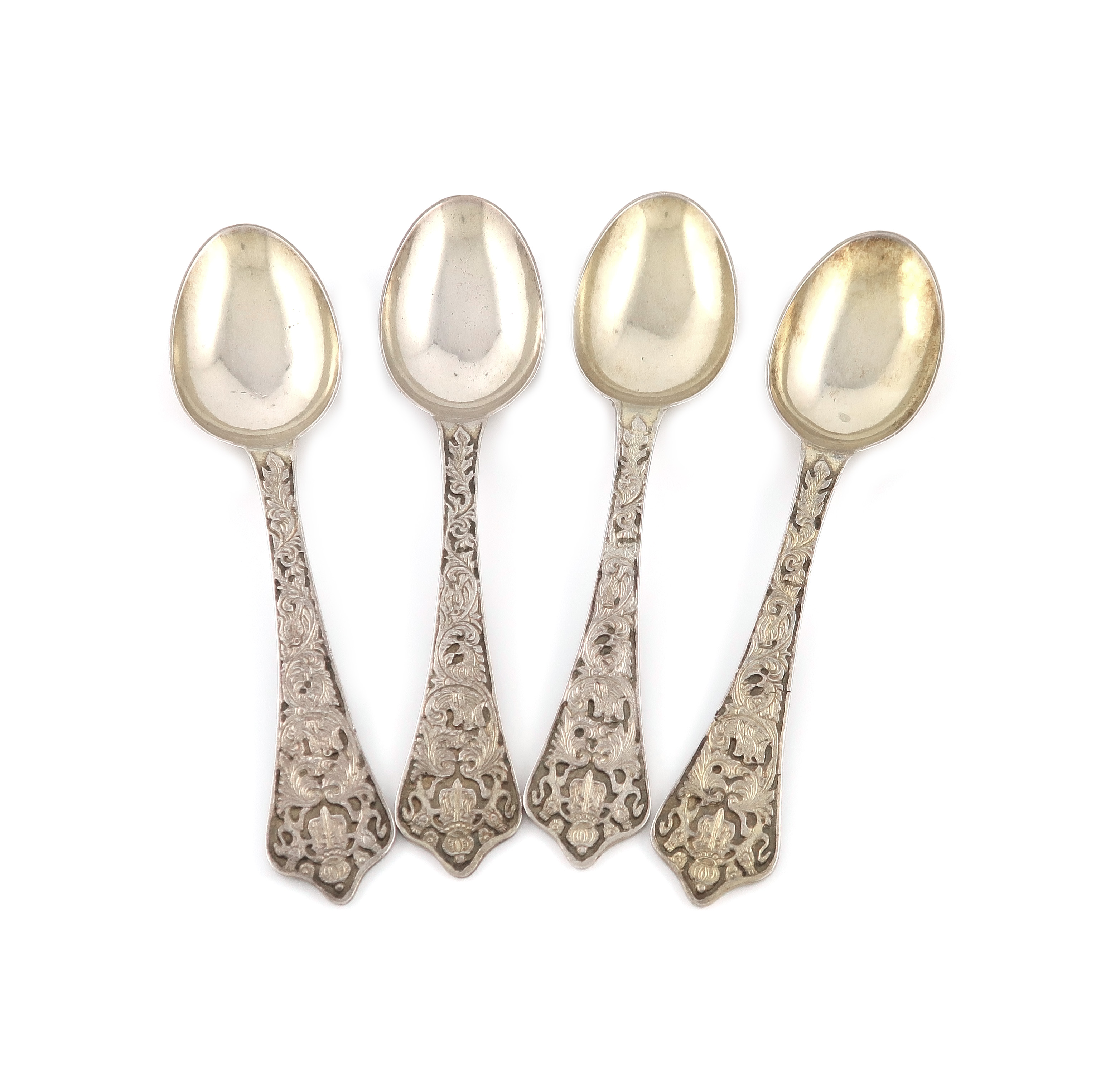 oval bowls, the reverse of the bowls with chased decoration and ribbed rat-tails, the terminals with armorials and foliate scroll decoration, length 19cm, approx. weight 10oz. (4)