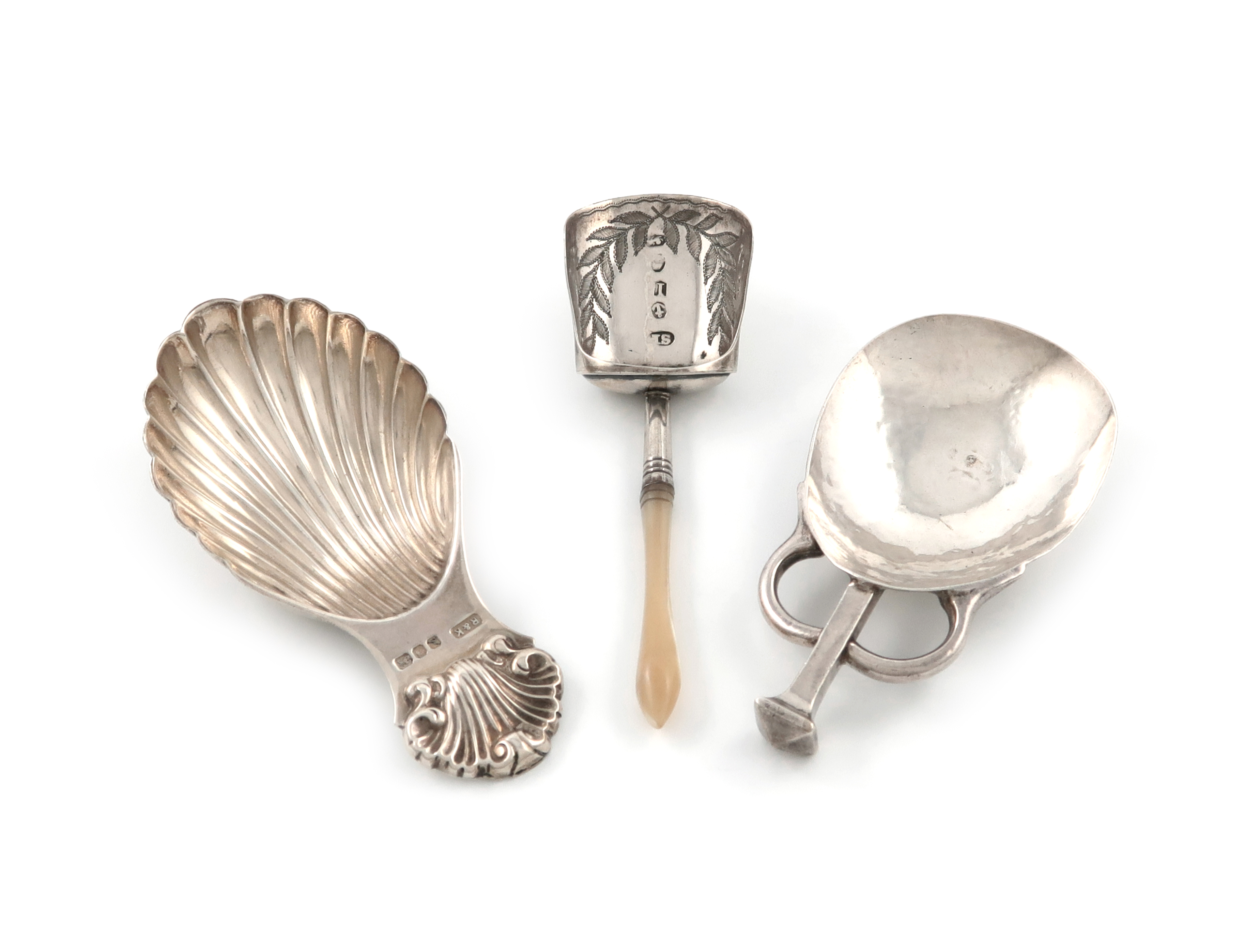comprising: an Edwardian Arts and Crafts one, by The Cooper Brothers, Sheffield 1907, fig-shaped bowl, pierced scroll and hob-nail shaped handle, a George III shovel shaped caddy spoon, by Samuel Pemberton, Birmingham 1809, engraved decoration, mother-of-pearl handle, and a modern caddy spoon with a fluted shell bowl, approx. weight 1.5oz. (3)