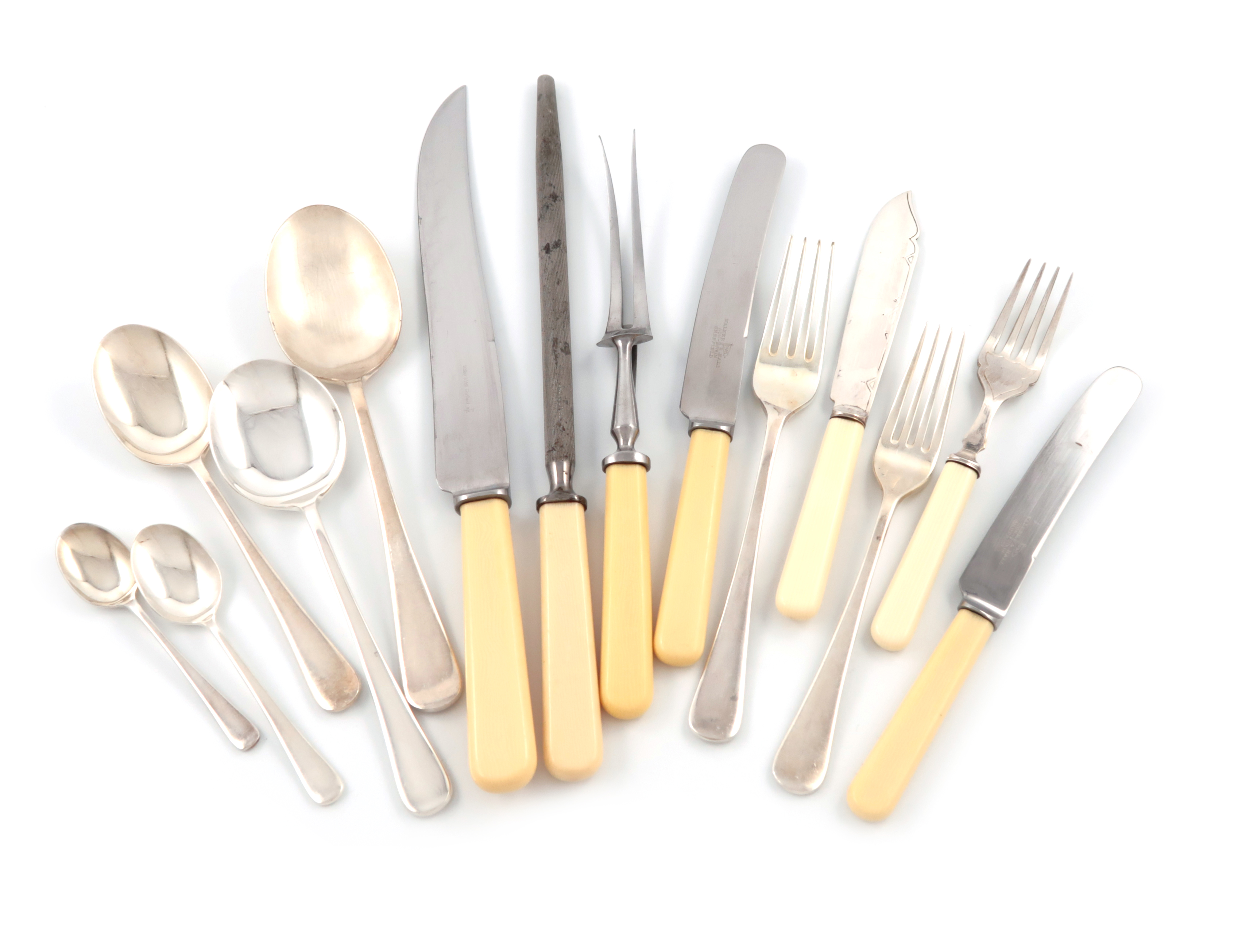 comprising: twelve table forks, twelve dessert forks, twelve dessert spoons, twelve soup spoons, twelve teaspoons, twelve coffee spoons, four tablespoons, plus twelve ivorine handled table knives, dessert knives and fish knives and forks, and a three-piece carving set, in a fitted two drawer wooden case with a hinged cover.