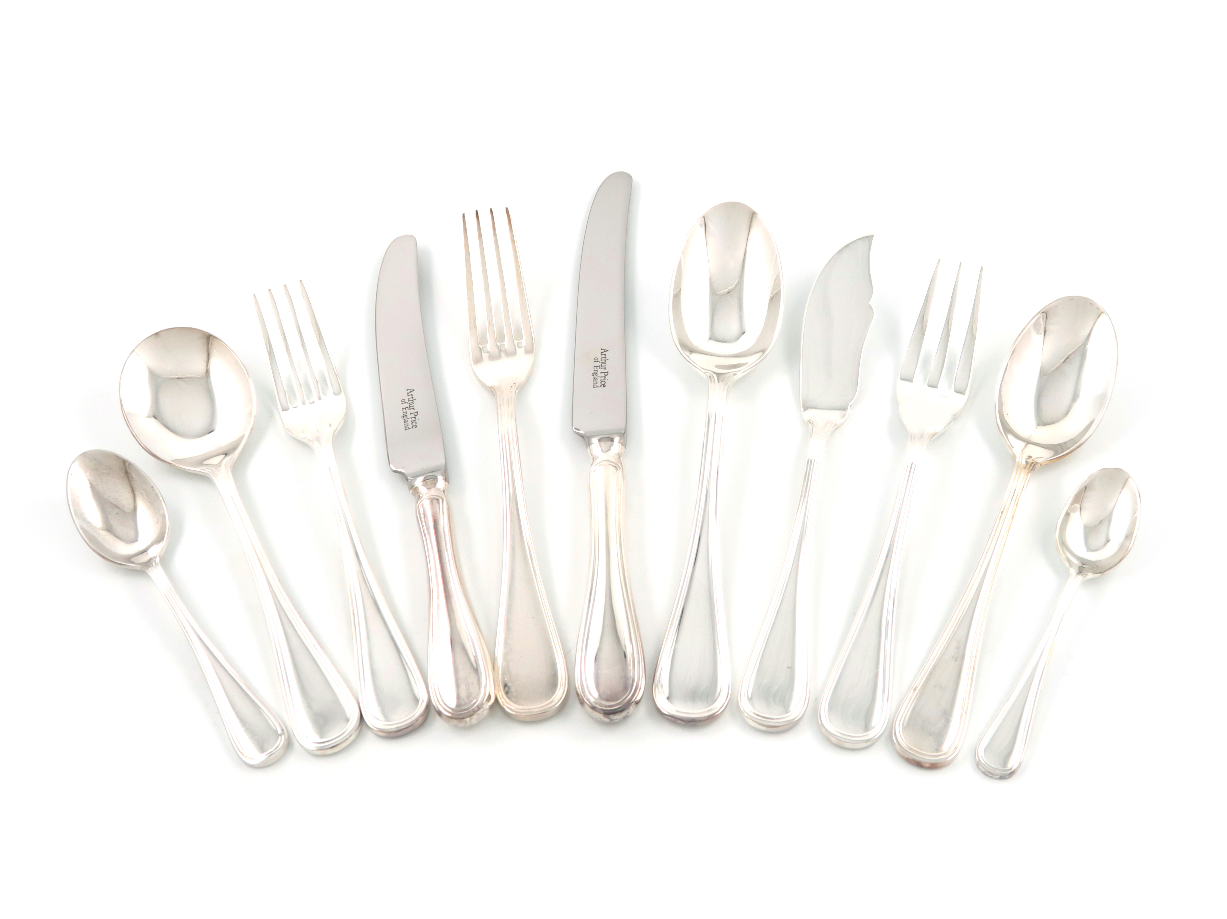 comprising: eight table knives, eight table forks, eight dessert knives, eight dessert forks, eight fish knives, eight fish forks, eight dessert spoons, eight soup spoons, four tablespoons, seven teaspoons and eight coffee spoons, in a fitted case.
