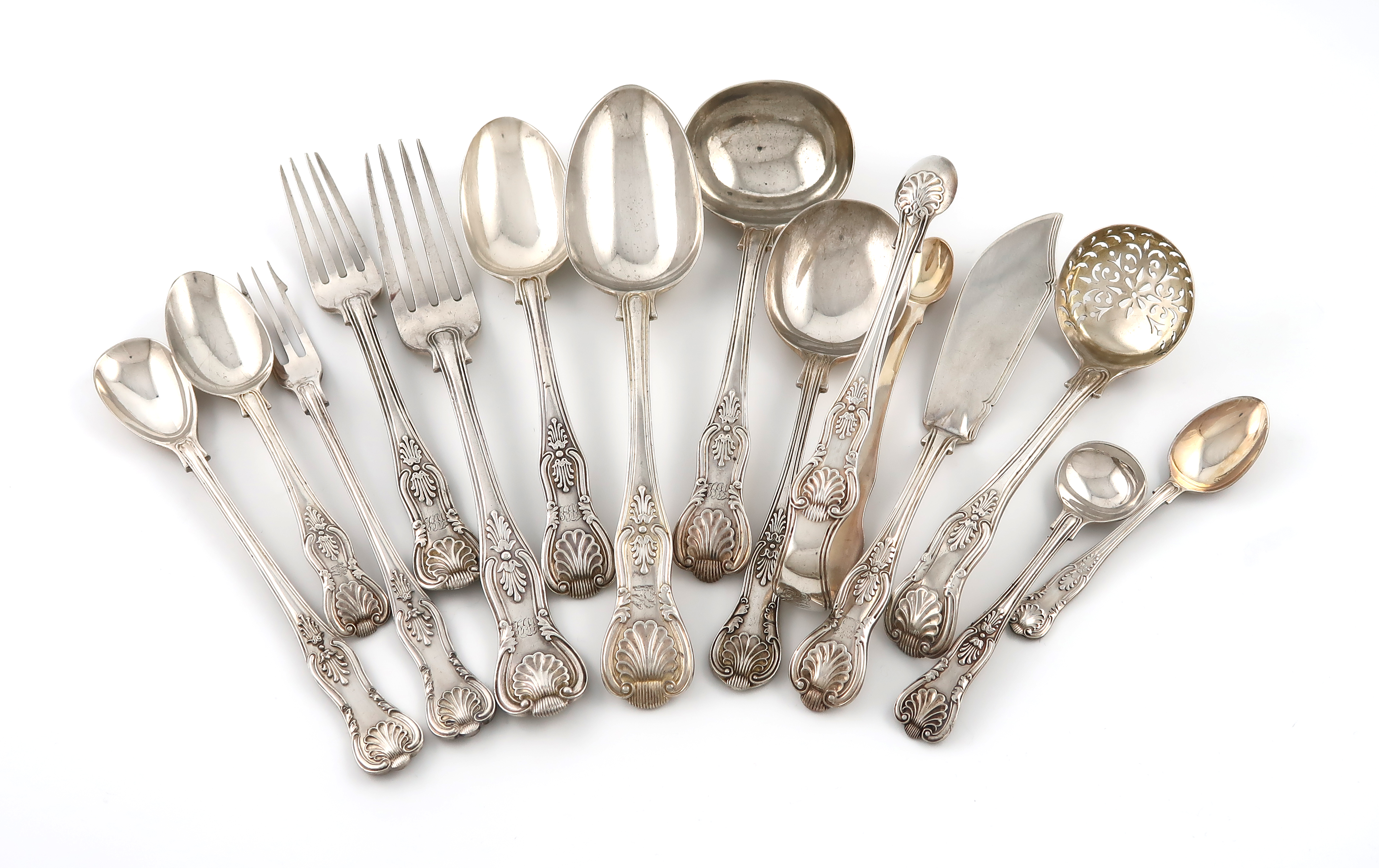 the terminals initialled, comprising: twelve table forks, twelve dessert forks, (two with different dates and makers), twelve teaspoons, twelve dessert spoons, twelve tablespoons, (six crested), and a pair of sauce ladles, plus other items by different makers: six modern soup spoons, six egg spoons, a sifting spoon, a pickle fork and chutney spoon, a butter knife and a cake knife, in a fitted wooden case, approx. weight 160oz. (qty)