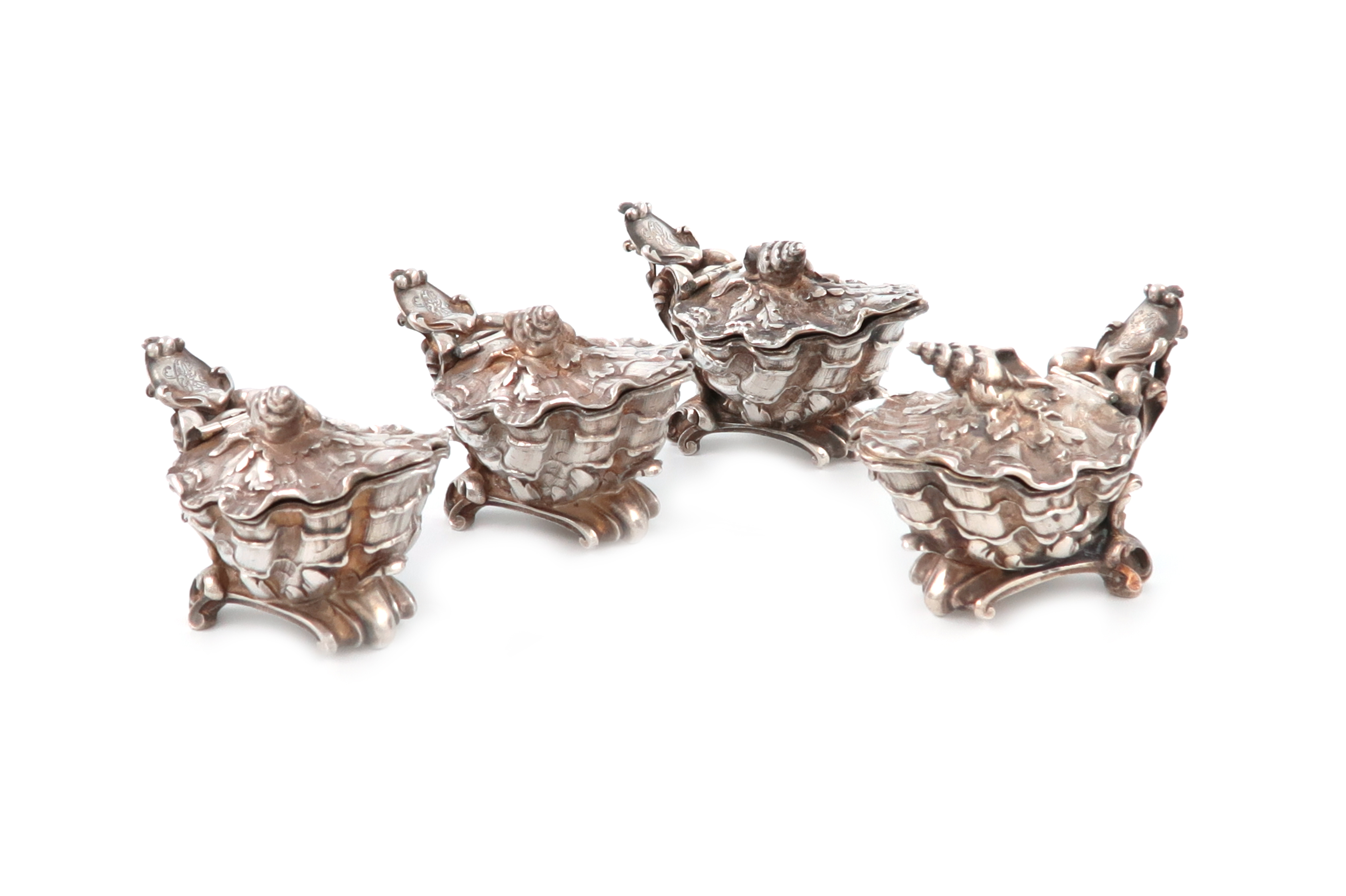shell form, with hinged shell covers with a shell finial, gilded interiors, pierced foliate bifurcated scroll handle, initialled, on double scroll feet, length 8cm, approx. weight 20oz. (4)