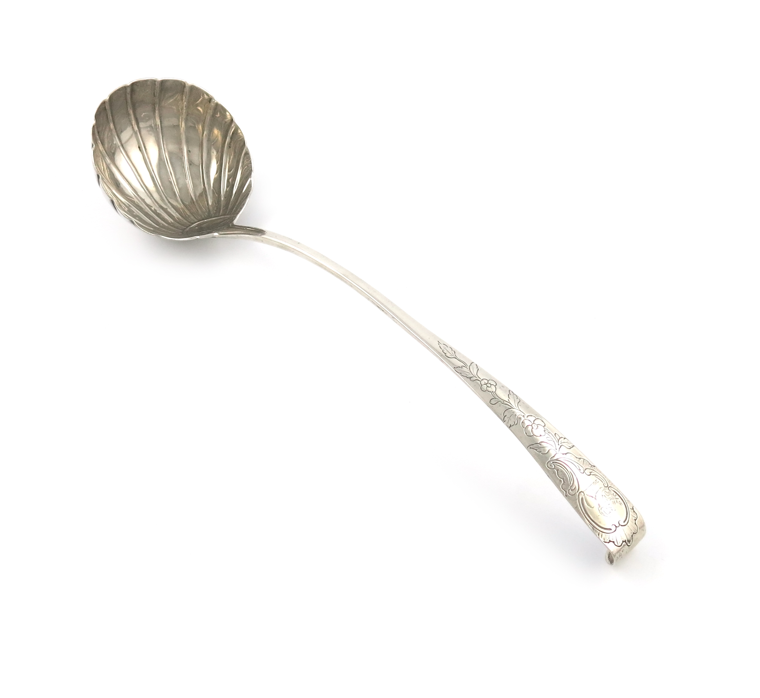 circular fluted shell bowl, the handle with chased foliate scroll decoration, engraved with a crest, length 38cm, approx. weight 7.3oz.