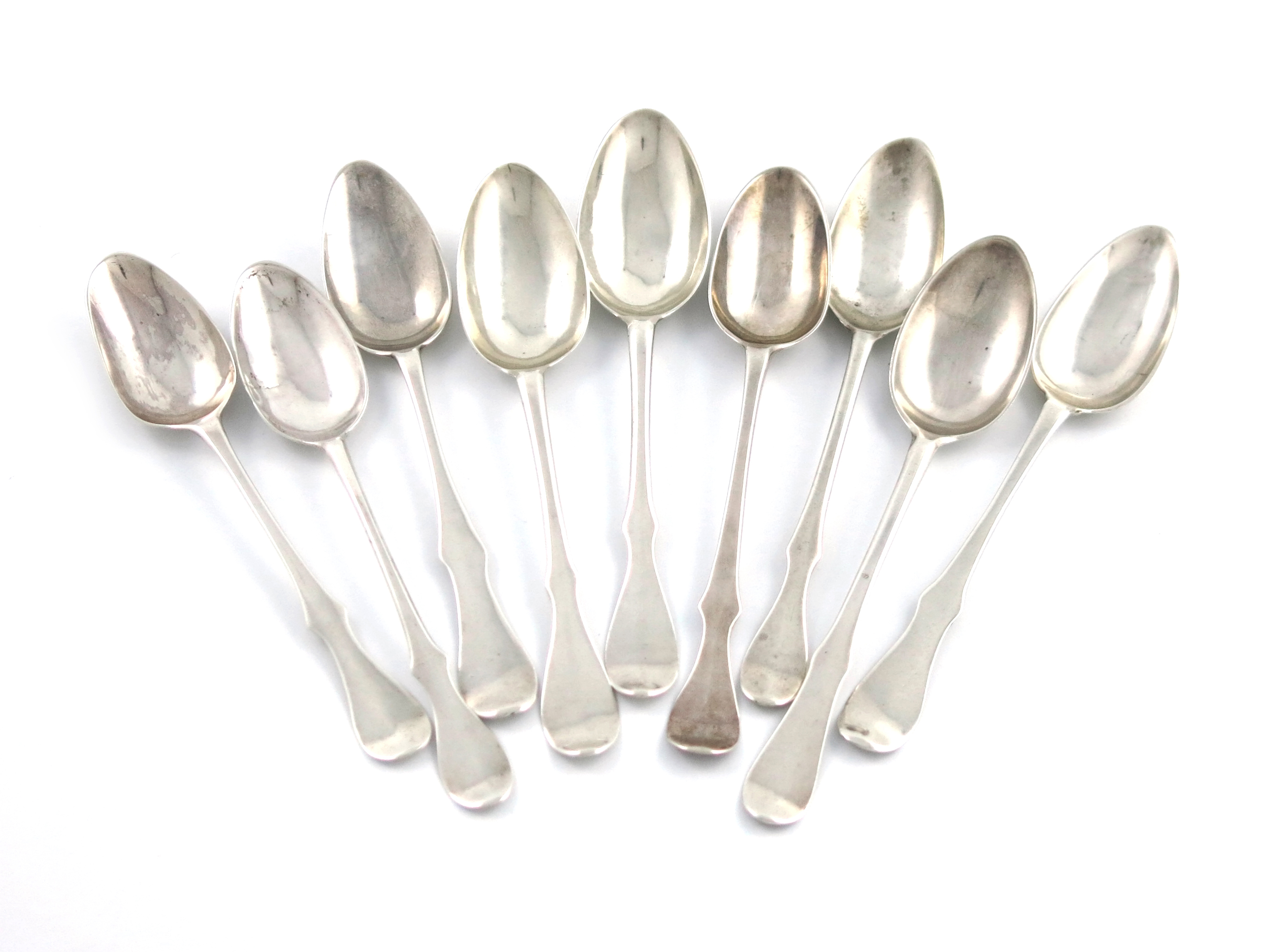 A collection of nine 18th century Scottish silver Fiddle pattern teaspoons,