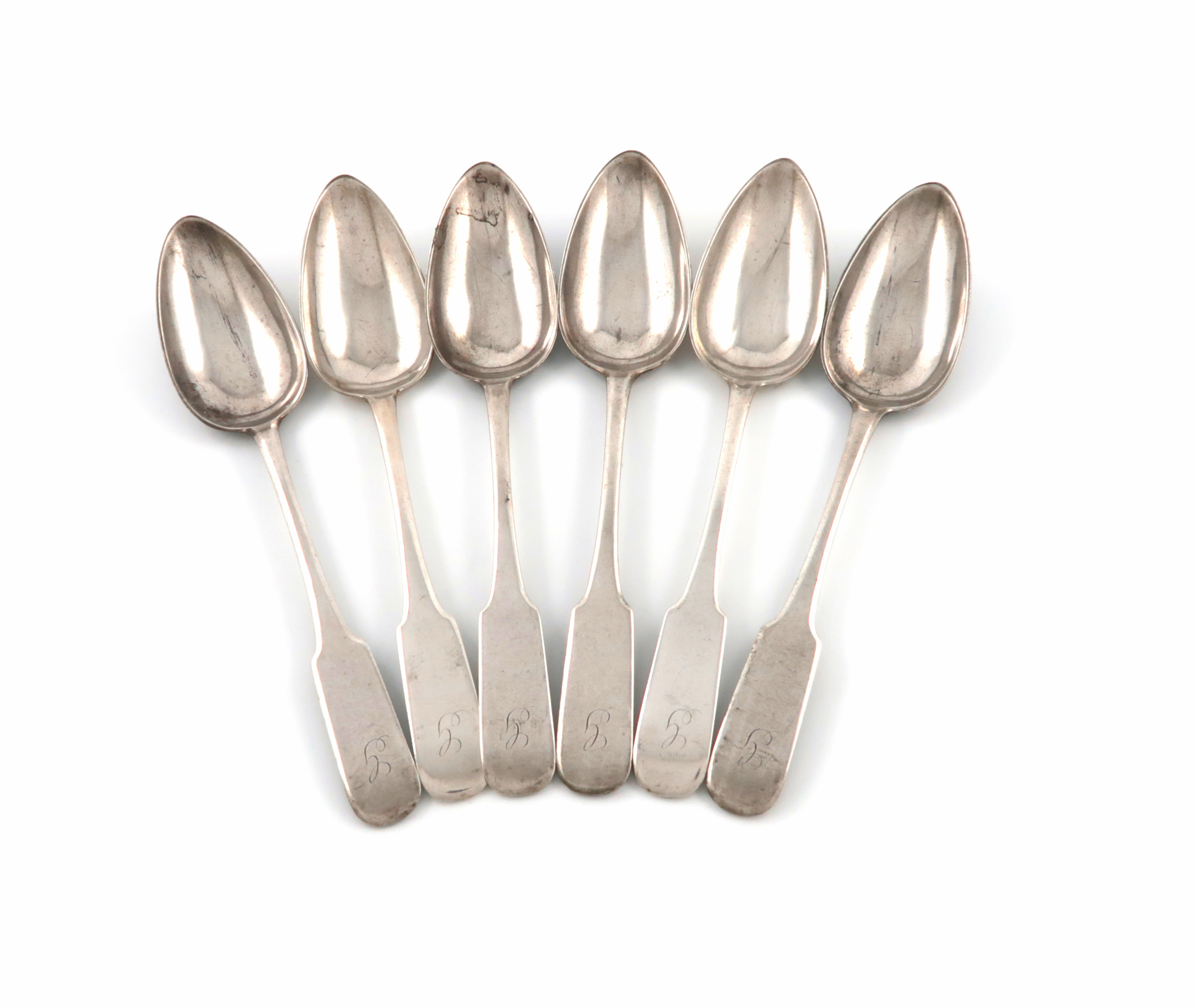 A set of six early 19th century Scottish provincial silver Fiddle pattern tablespoons