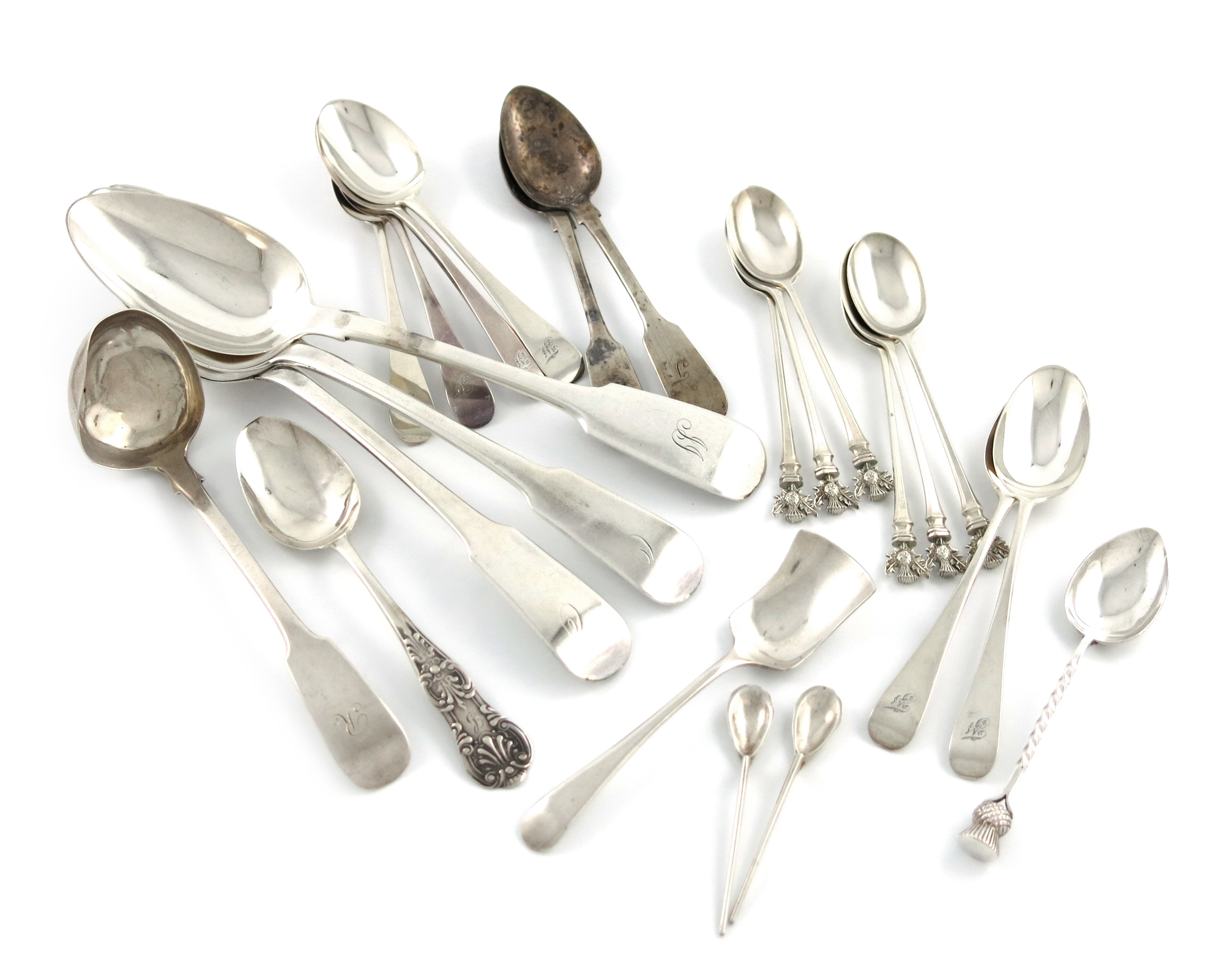 comprising: a set of six Old English pattern teaspoons, by Wakely and Wheeler, London 1888, with marks for James Hardy of Aberdeen, a pair of Aberdeen teaspoons by George Sangster, a London tablespoon, retailed by George Jamieson Aberdeen, plus Edinburgh and Glasgow items: a toddy lade, two tablespoons, eight teaspoons, two salt spoons and an electroplated sugar spoon, approx. weighable 14.4oz. (qty)