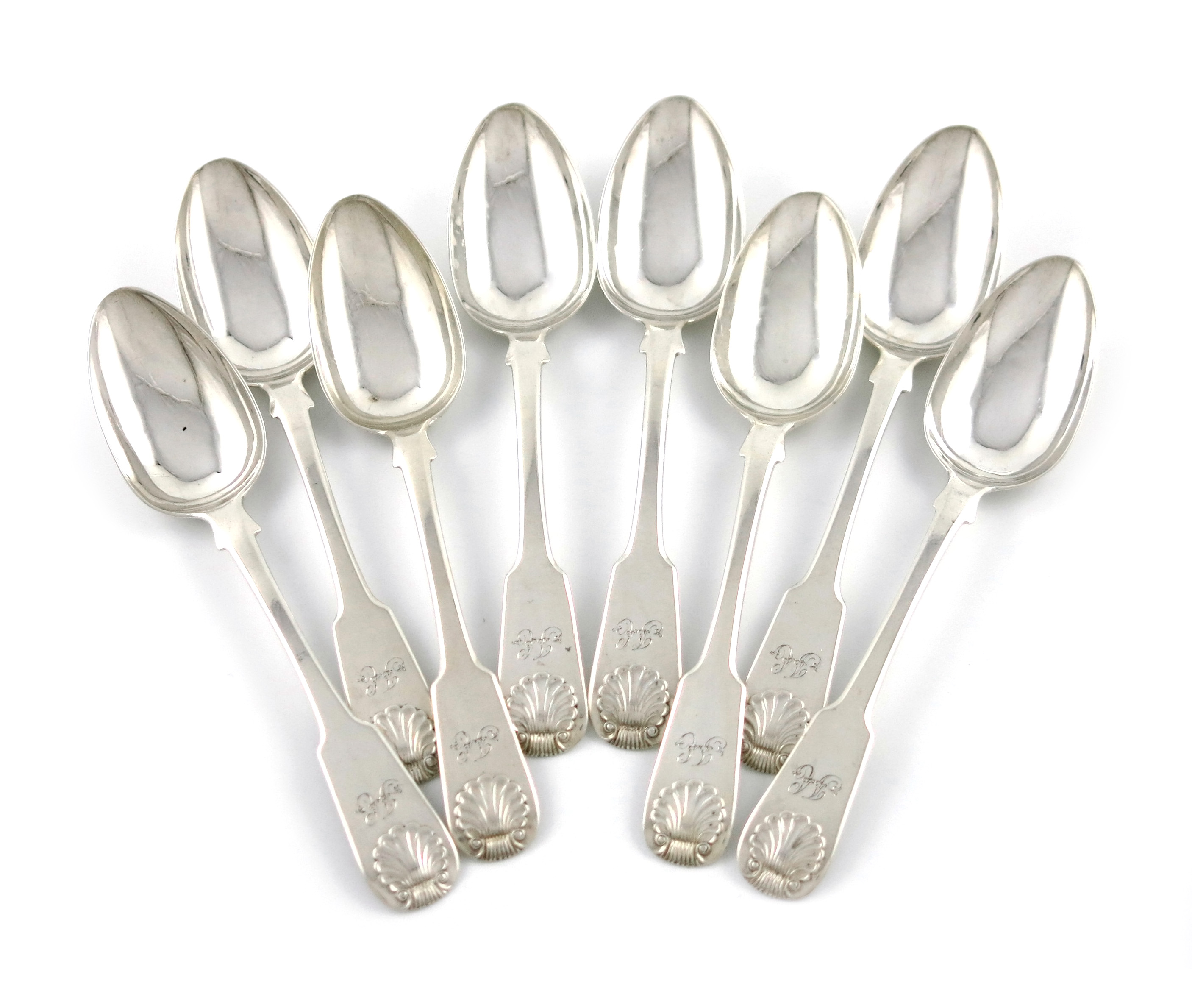 An early 19th century set of eight Scottish provincial silver Fiddle and Shell pattern teaspoons
