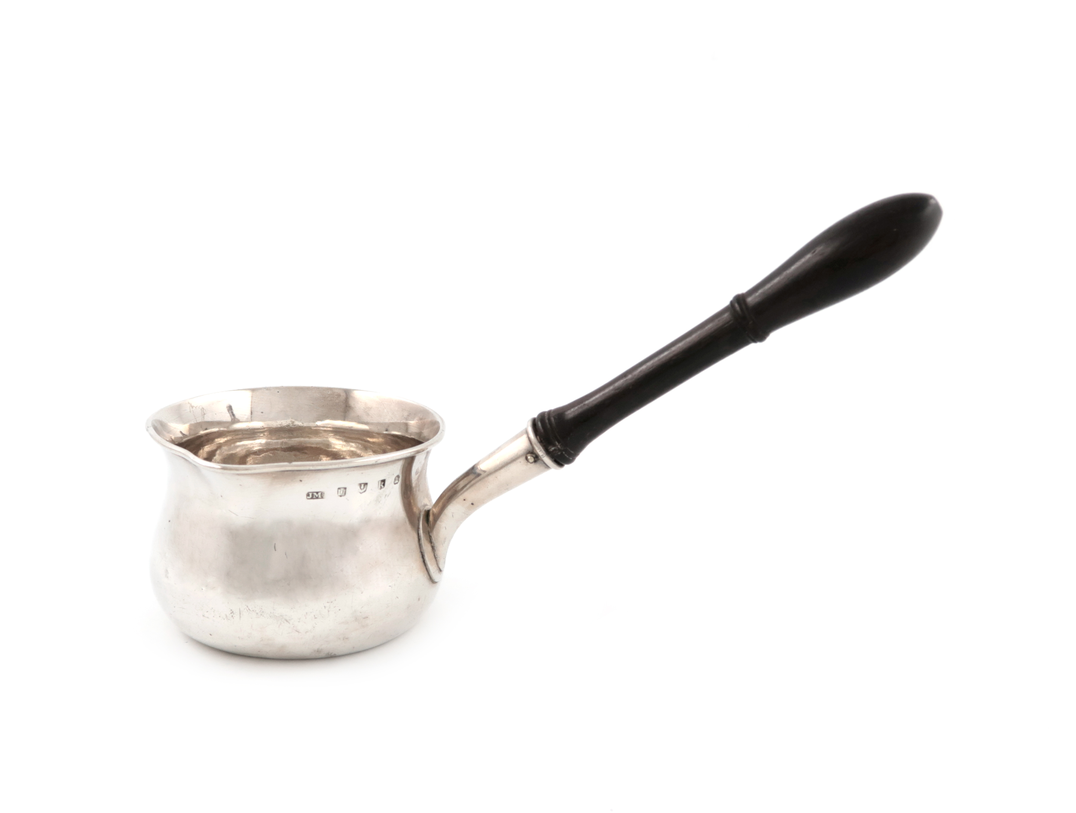 circular form, plain lip, turned wooden baluster handle, length 23cm, approx. weight 5.4oz.