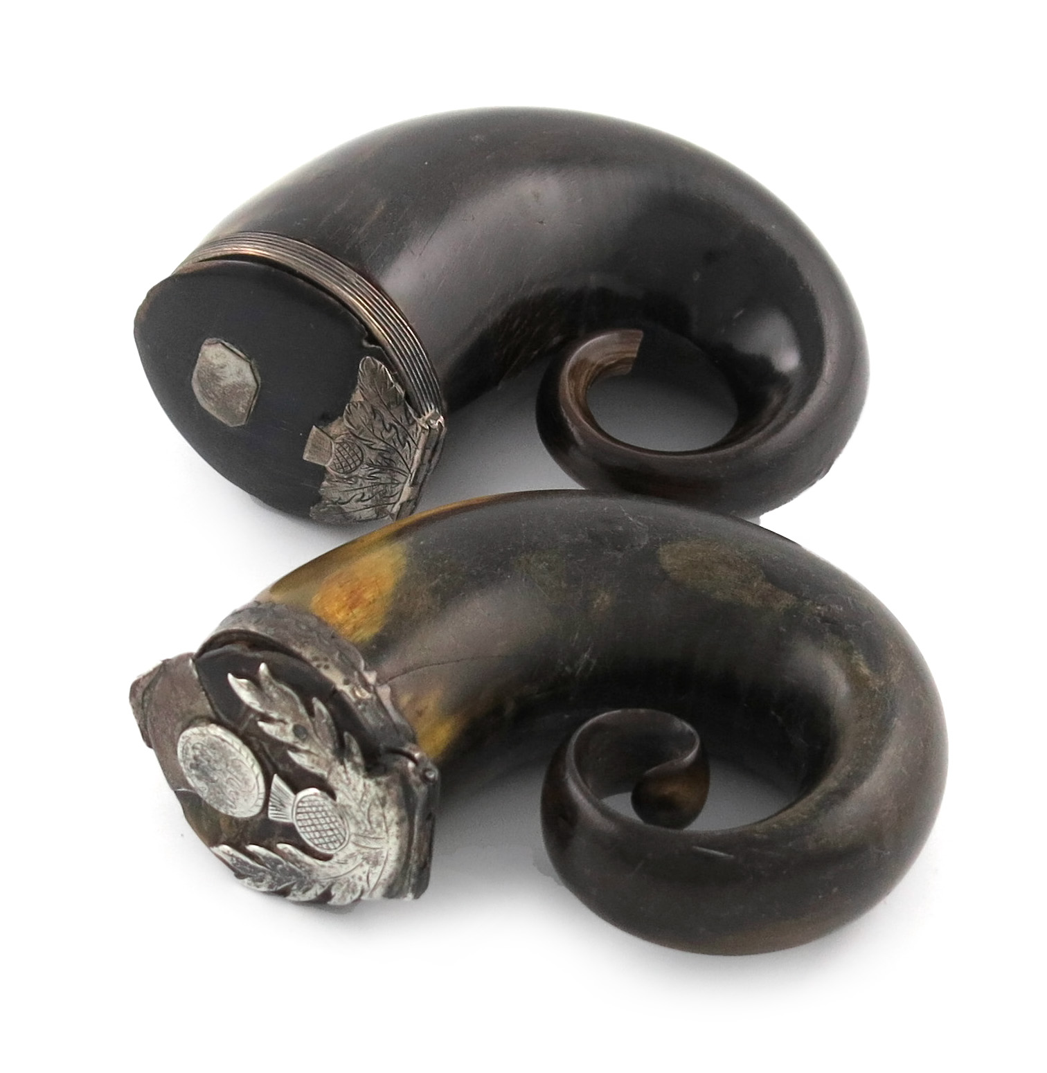 conventional form, the hinged cover set with a thistle and initials, engraved borders, plus another snuff mull, reeded border, the cover with an engraved thistle. (2)