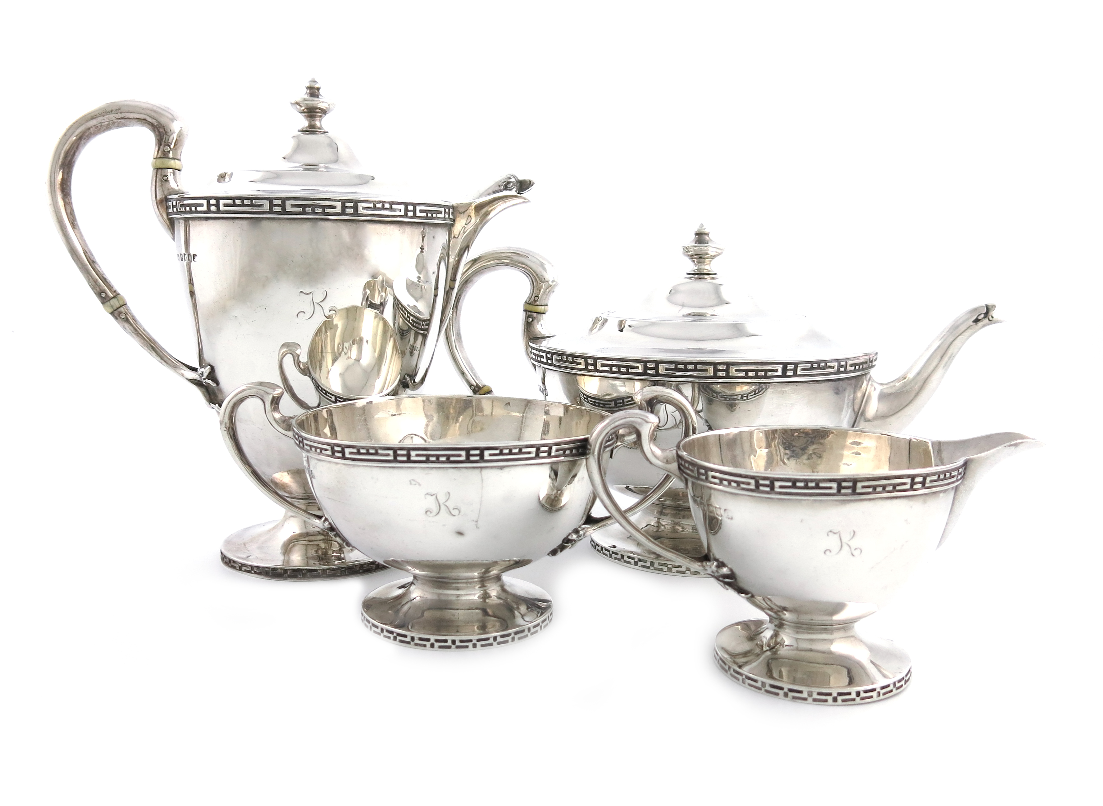 circular tapering form, bifurcated scroll handles with ivory insulators, stylised Greek key border, domed covers with urn finials on raised circular bases, initialled, approx. weight 66oz. (4)