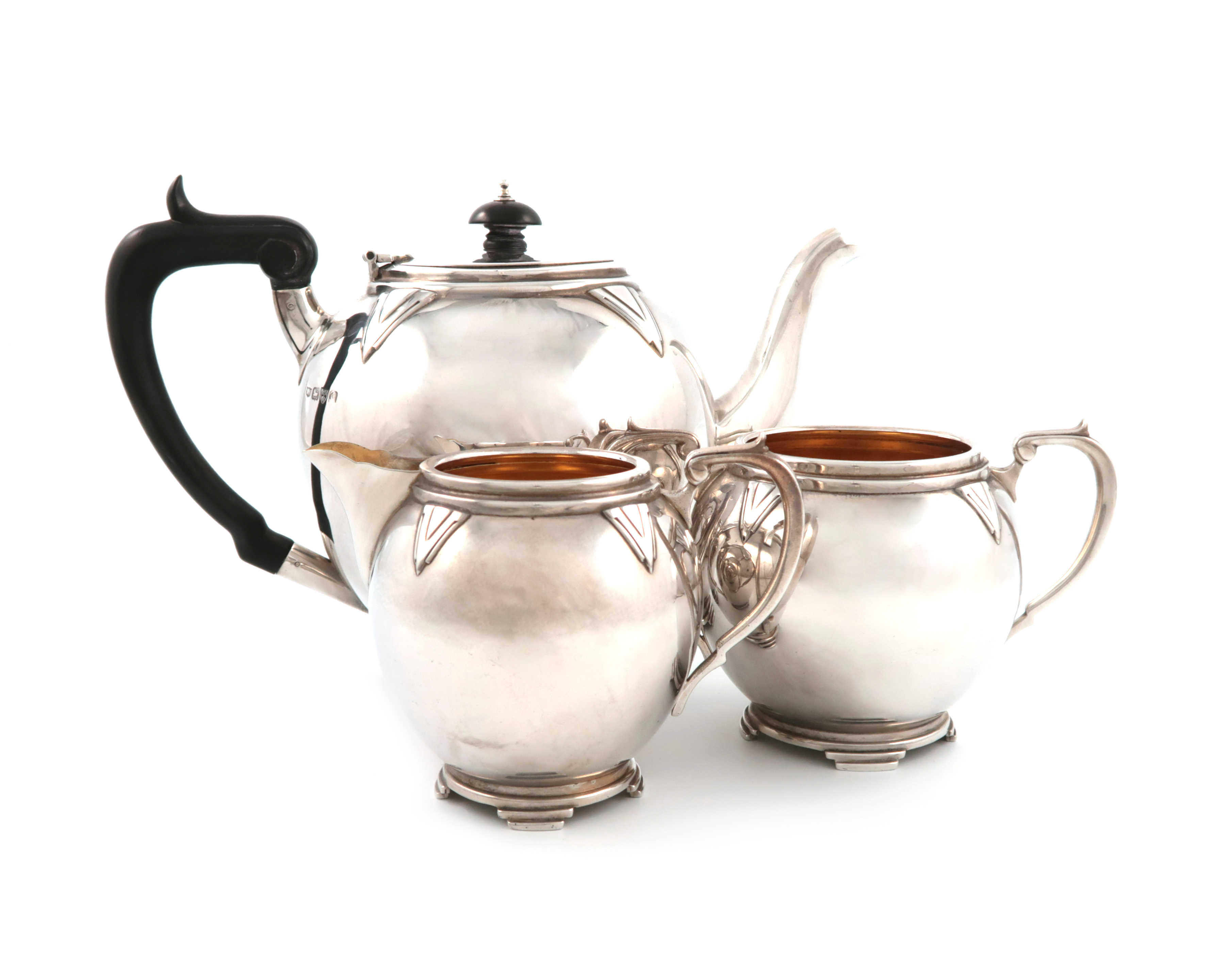globular form, scroll handles, stylised decoration, on four stepped bracket feet, length handle to spout 26.4cm, approx. weight 30.5oz. (3)