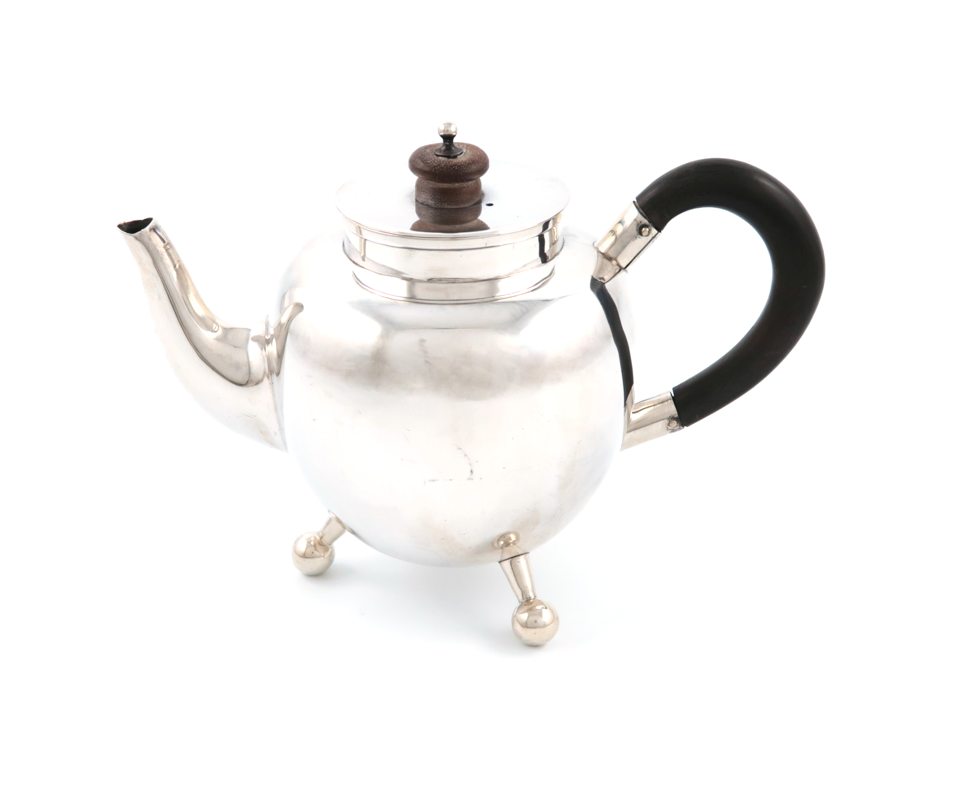 in the Christopher Dresser manner, ovoid body, scroll handle, pull-off cover on three tapering legs with ball feet, height 13cm, approx. weight 9oz.